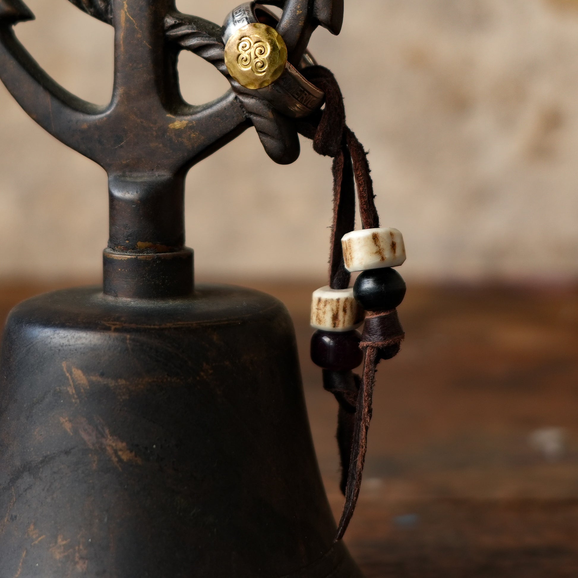 NIXONさんにて、アメリカの25セントコインを全て手作業でリング状に加工していただいたものに、天竜の鹿革ヒモと鹿角ビーズ、アクセントにホワイトハーツビーズもプラスしたスカーフリングです。