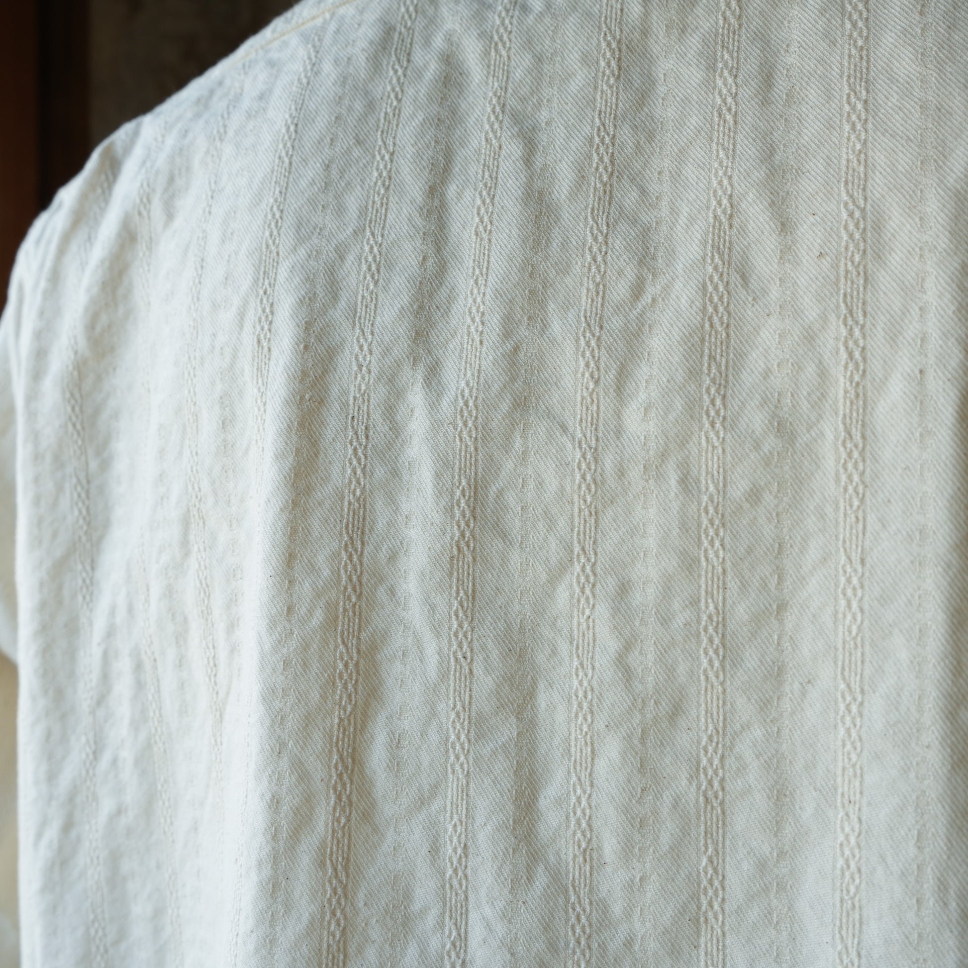 This fabric design, with its stripes created through weaving techniques, evokes a century of history. The complex layering of warp threads creates a unique three-dimensional effect and a striking appearance. This work shirt, with dual pockets, combines practicality with the classic feel of the early 20th century. It's a well-balanced piece that exudes tradition while also being easy to wear today. Be sure to pick it up and enjoy the depth and comfort of the fabric.