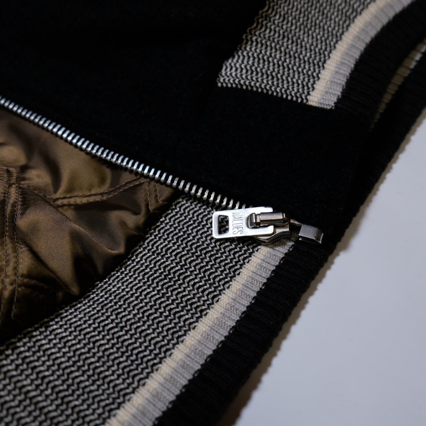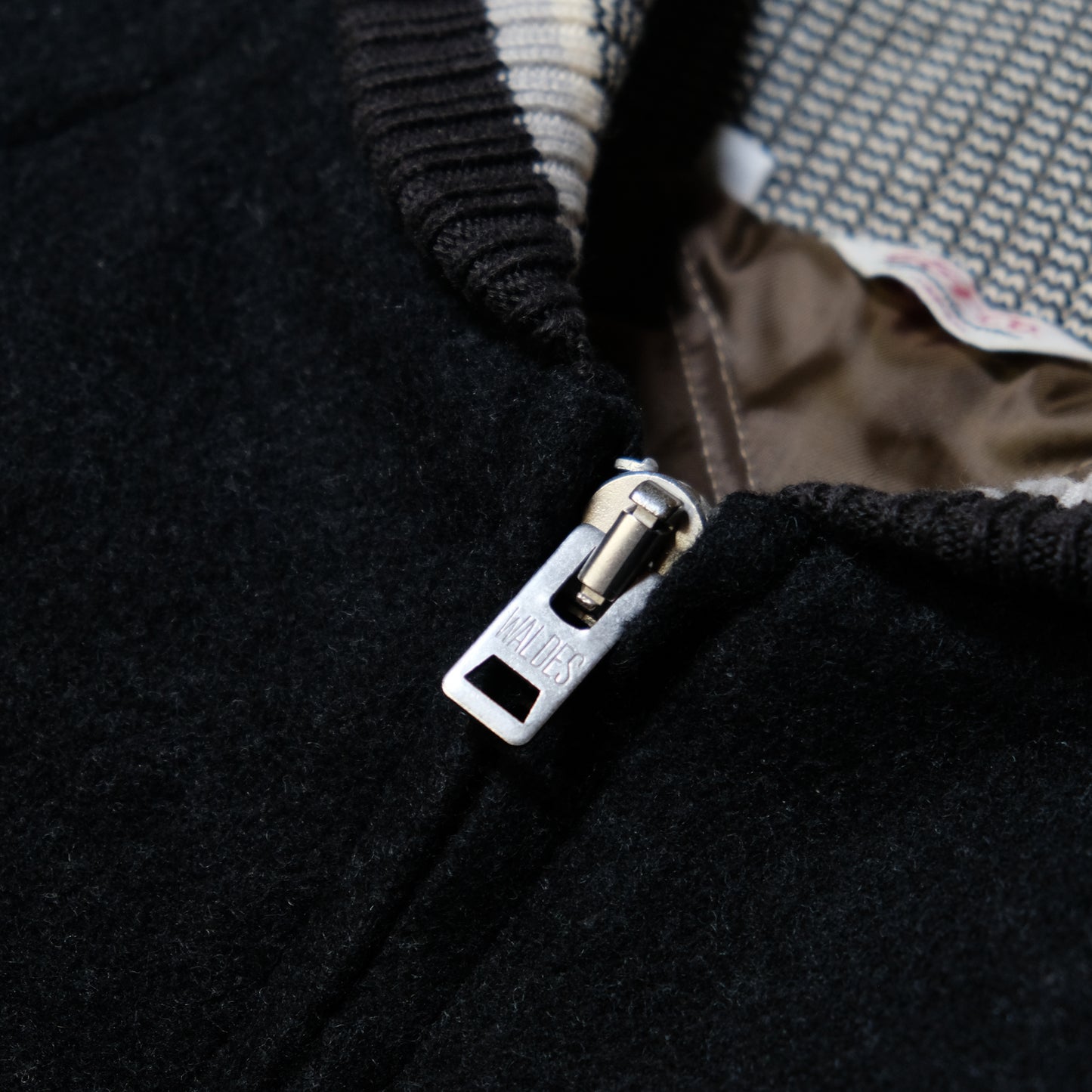 A wool shawl collar club jacket. This jacket uses original quilted padding for the lining. Heavy ribbed cotton fabric with original color scheme. The front zipper is a thick size 8 with aluminum teeth and a rod-shaped puller.