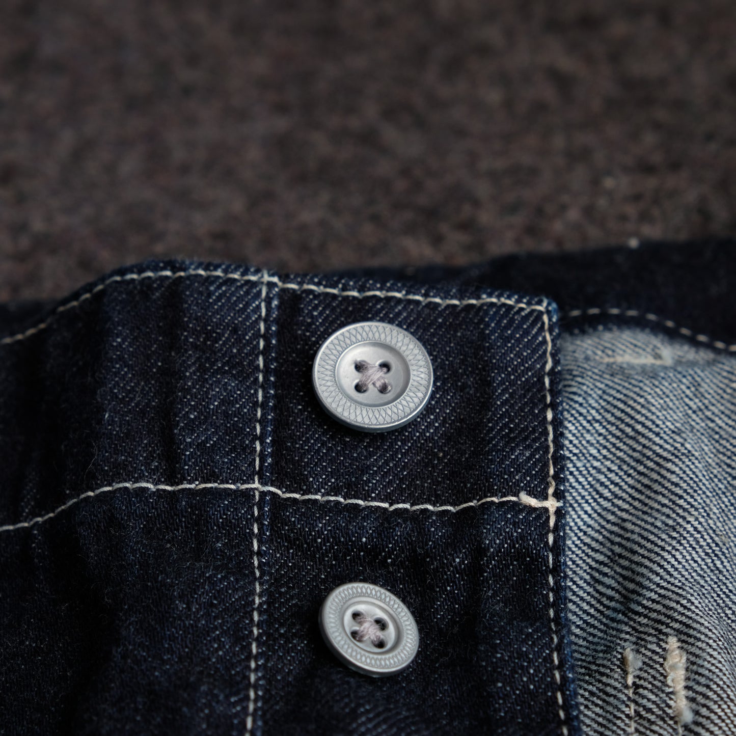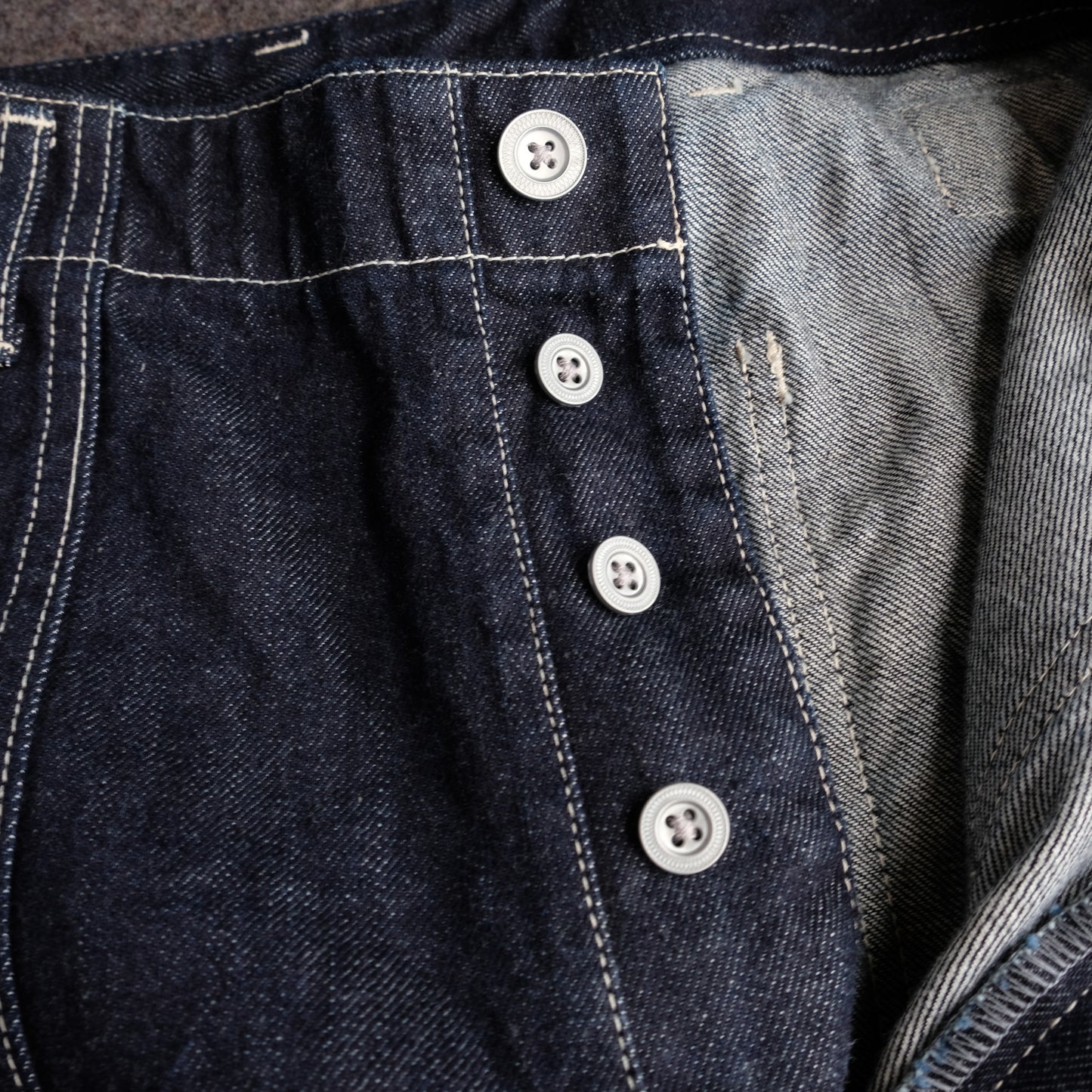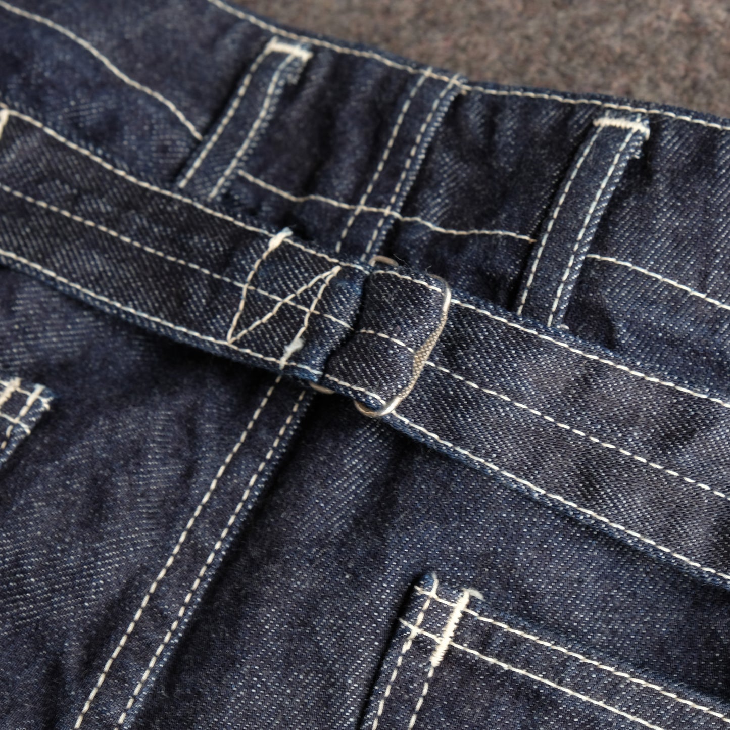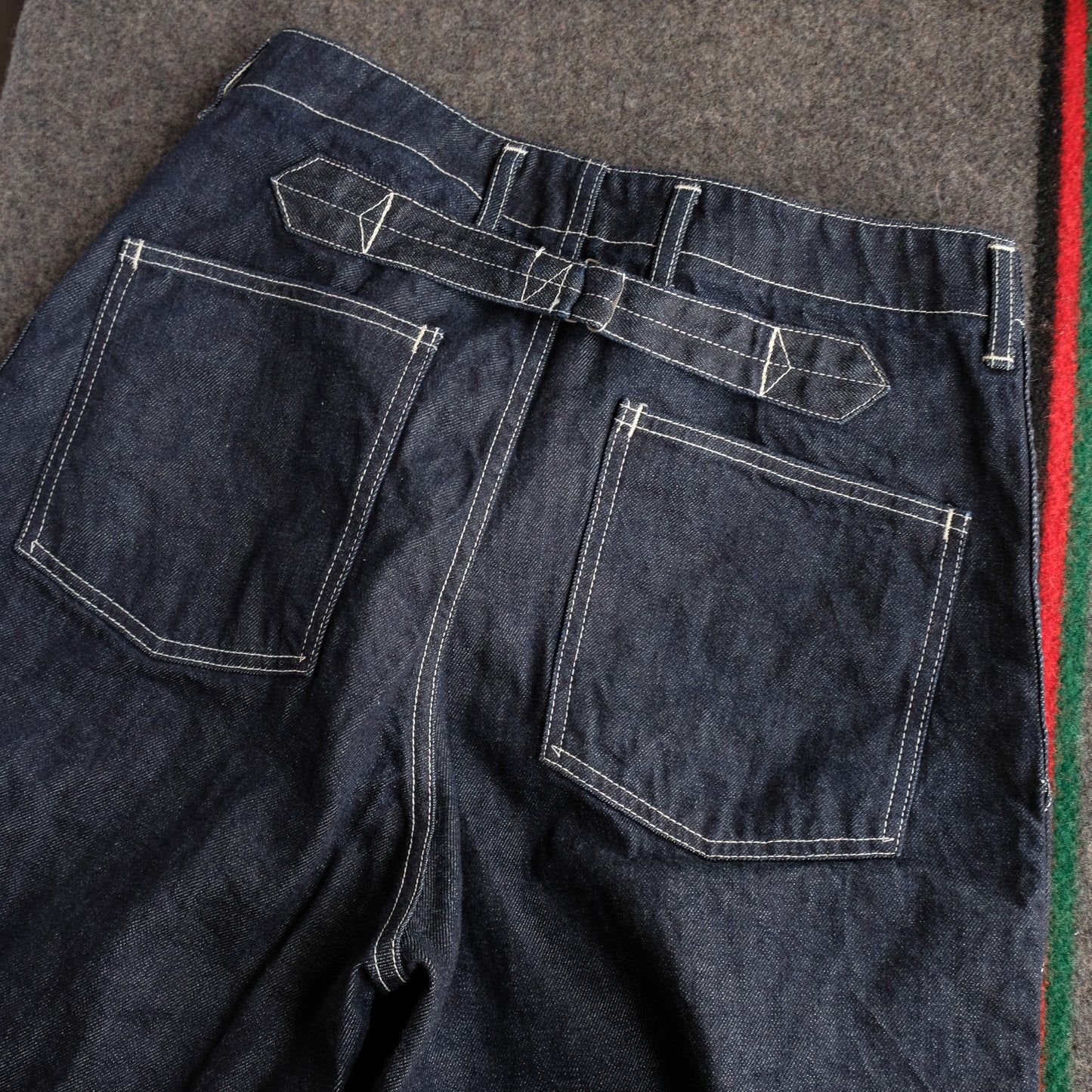 The design is based on old-fashioned ARMY PANTS and combines archive piece details from various eras. The distinctive button fly and cinch back are retained. Deep blue 12oz denim. A denim jacket that can be worn as a set is also released.