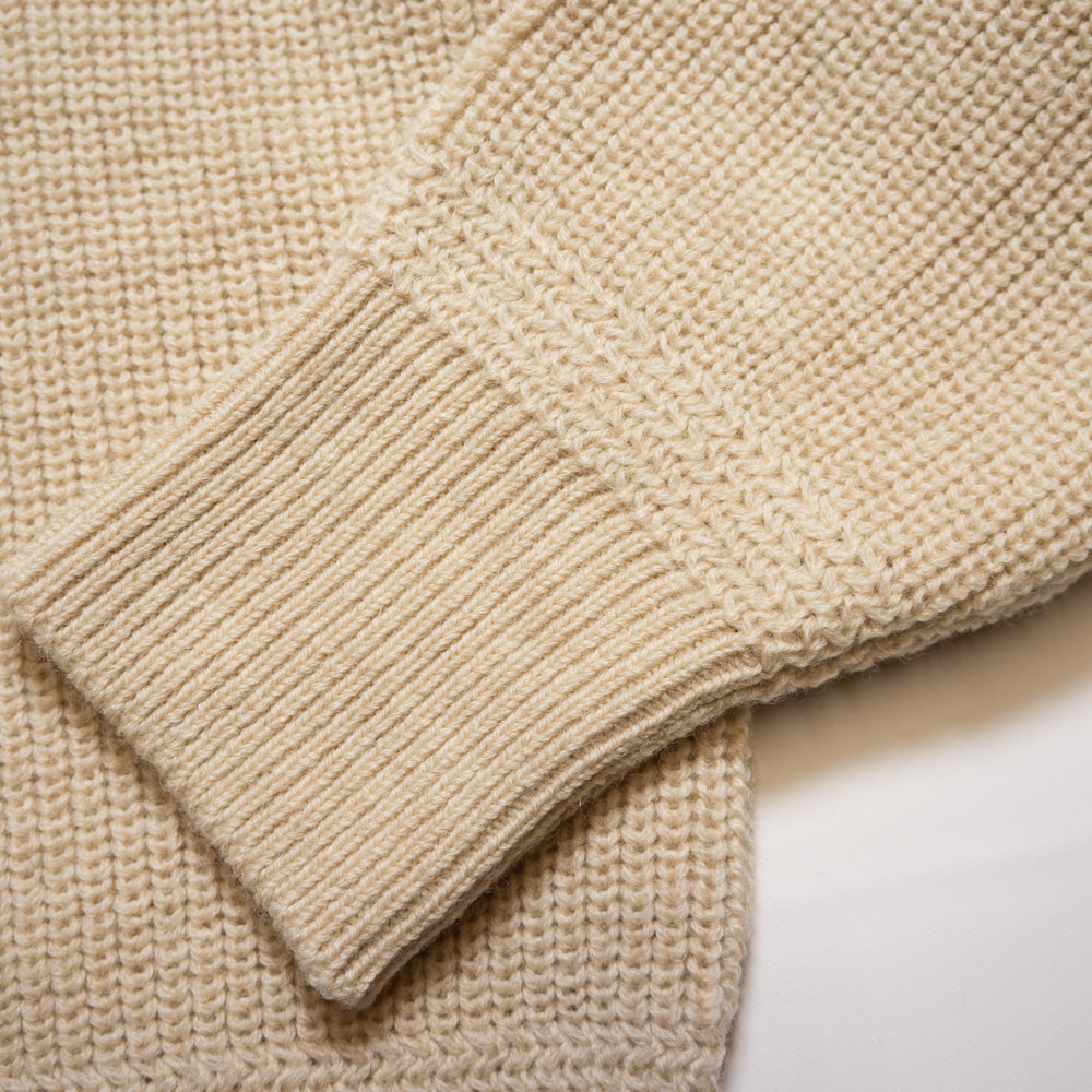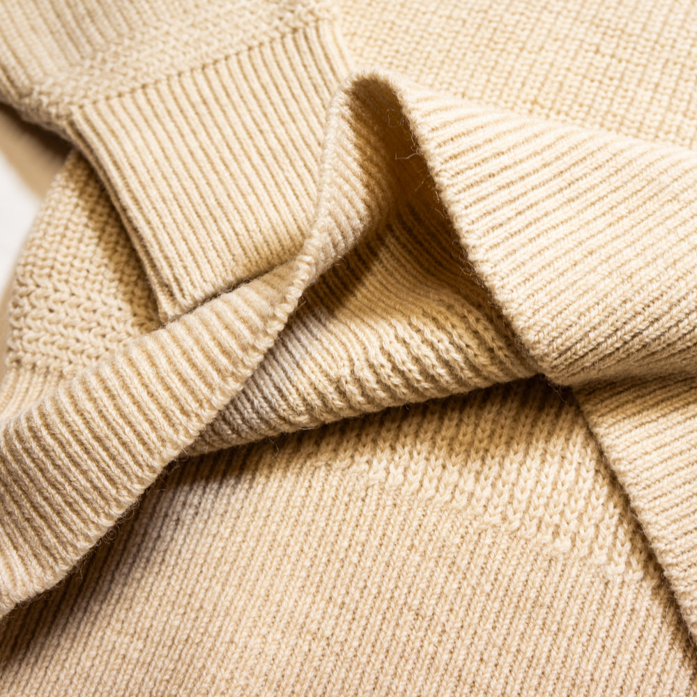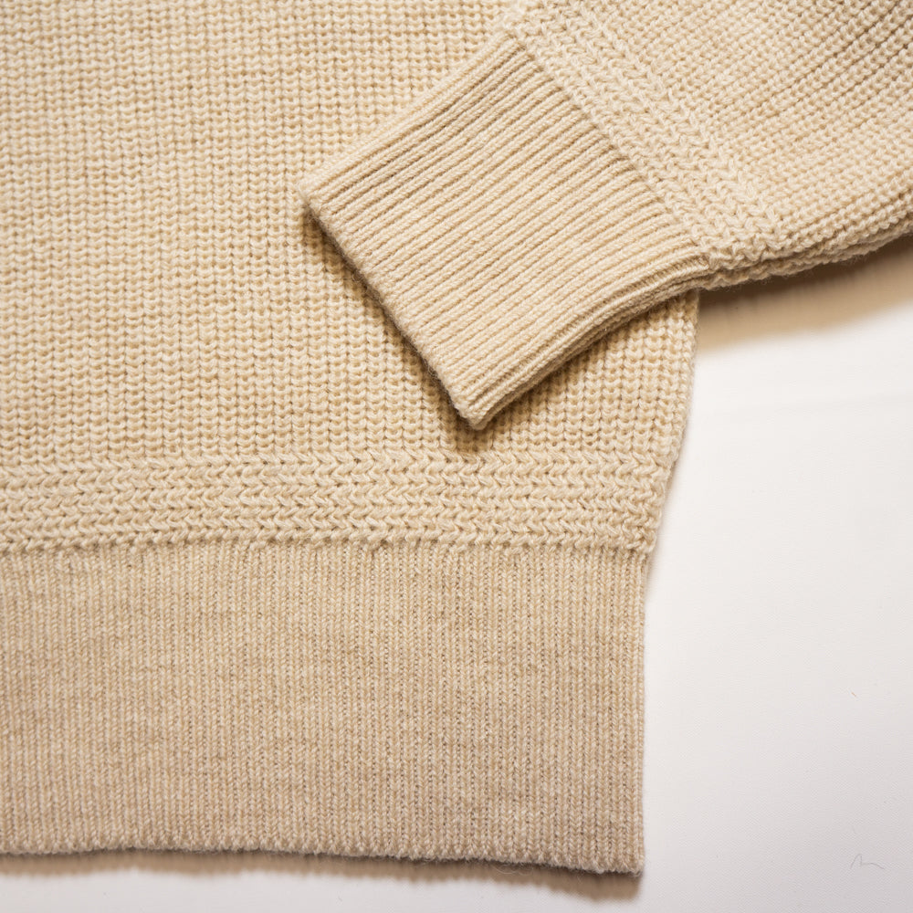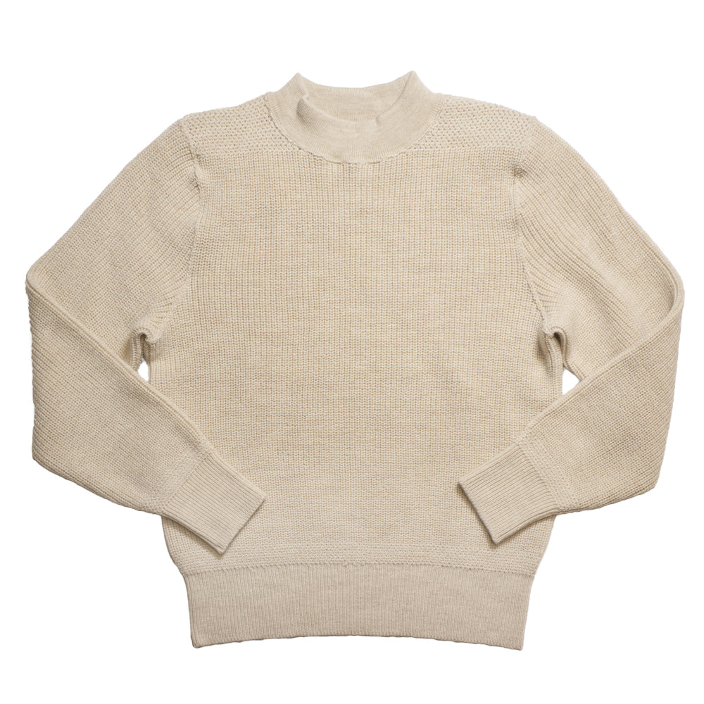 This product is a reconstruction of the Red Cross sweater from the 1940s. It has been arranged in a mock neck style. It uses a half-blend yarn of British wool and South America. It is a warm material that is firm and resilient, and does not easily lose its shape. It has been washed.