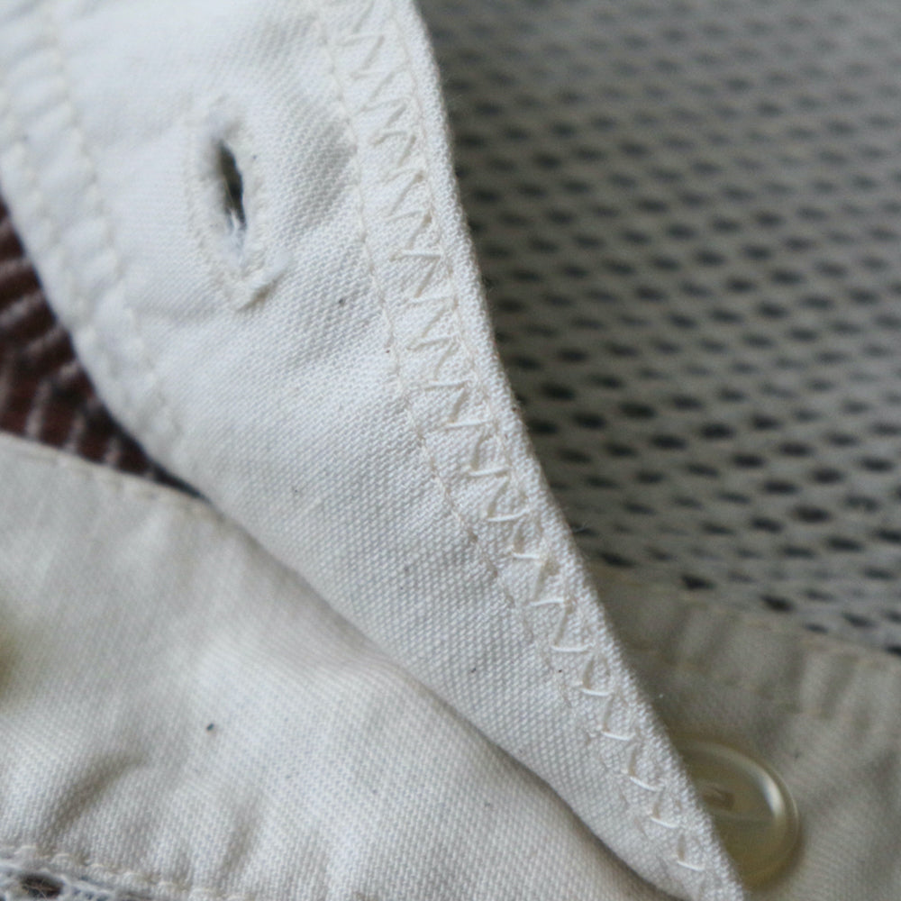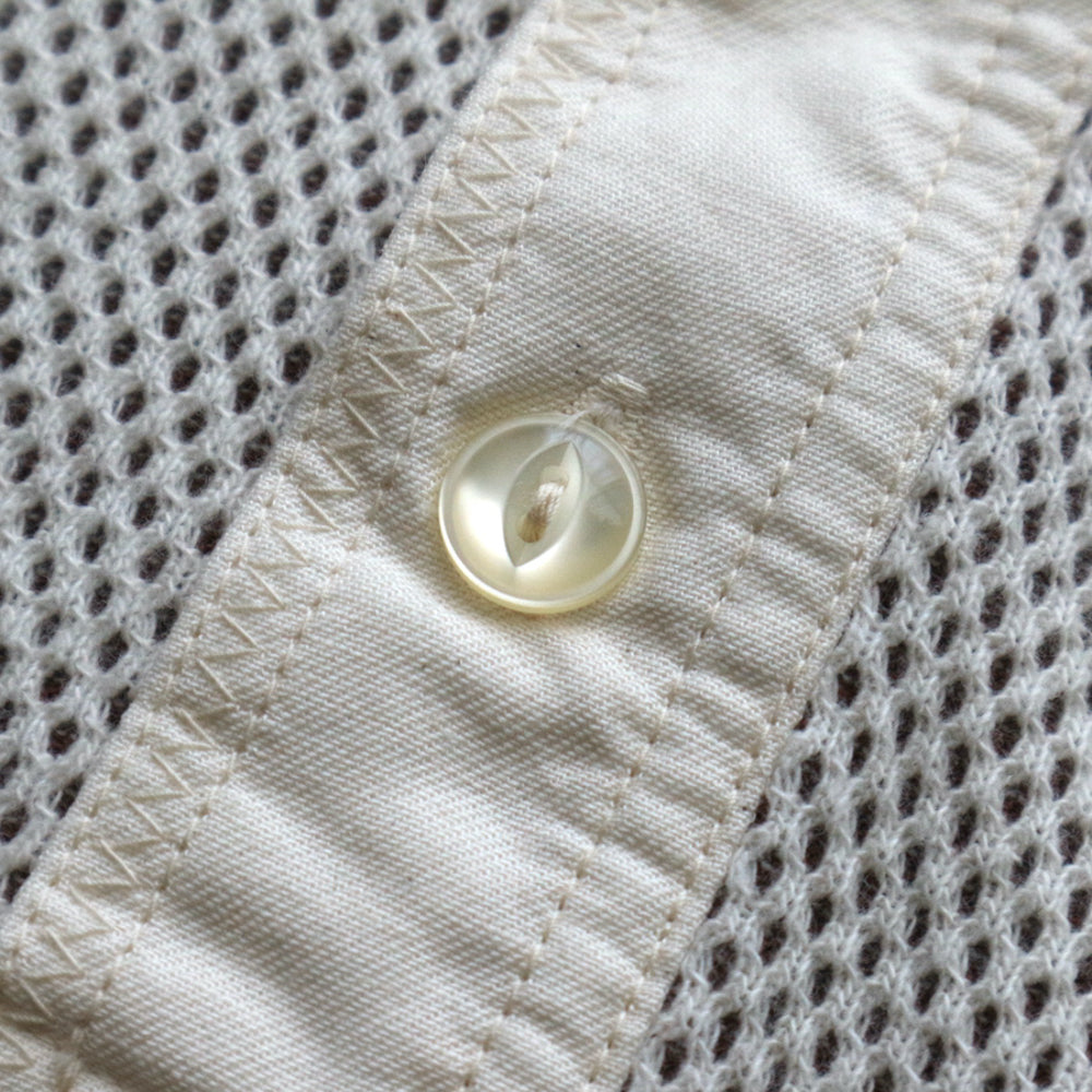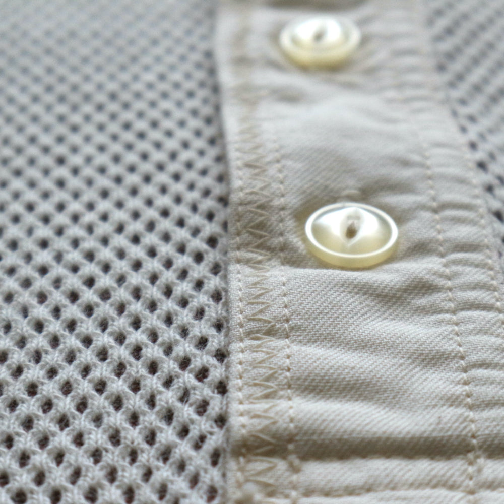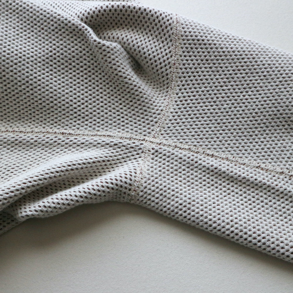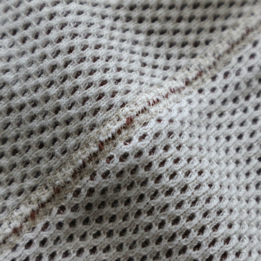 The fabric is an original 100% cotton double-faced thermal that has been uniquely reconstructed from vintage hexagonal honeycomb thermal using a special knitting machine in Wakayama.