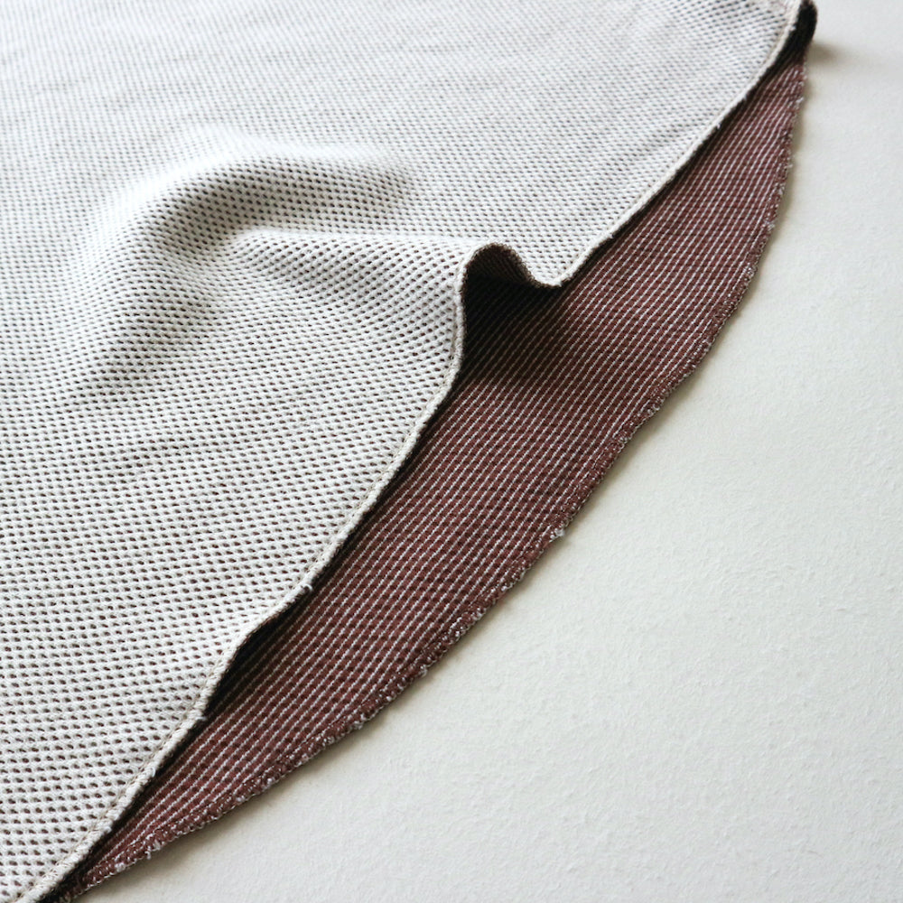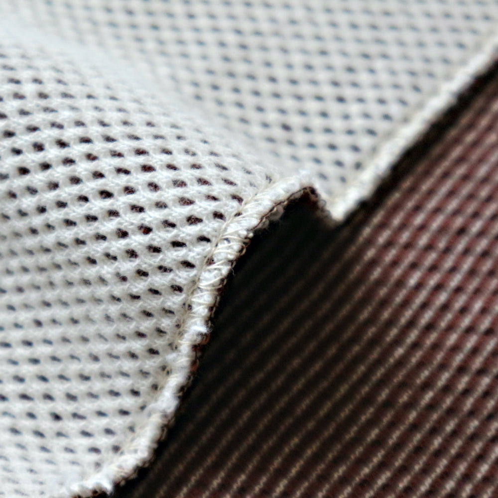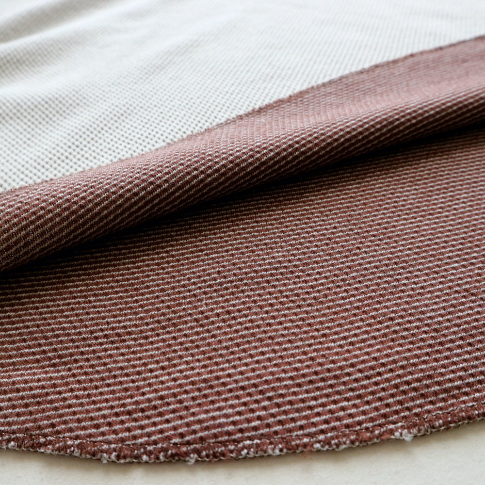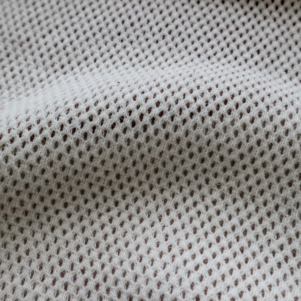 In ordinary honeycomb fabrics, the lining is the same color as the outer fabric, and both sides have a embossed pattern, but this fabric uses a special knitting machine and knitting method, which results in a hexagonal honeycomb pattern on the outer fabric, a pinborder pattern on the lining that is a different color from the outer fabric, and a double-faced fabric with a flat structure that feels good against the skin.The color of the lining affects the color of the outer fabric, creating an atmospheric body color, and it creates a unique material texture that is soft, thick, and warm to wear, and the more it ages the more it is worn.