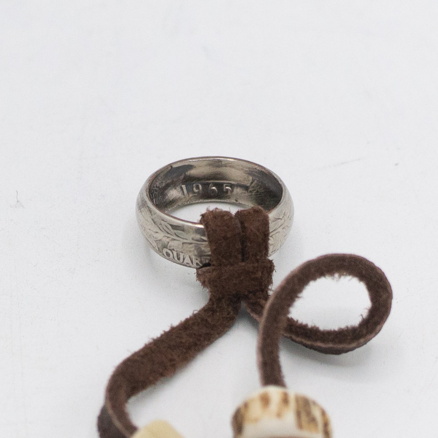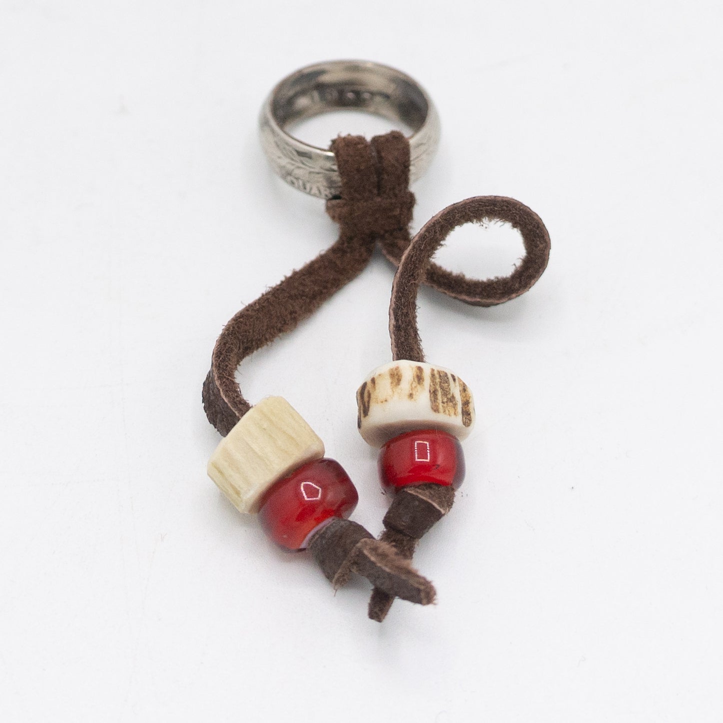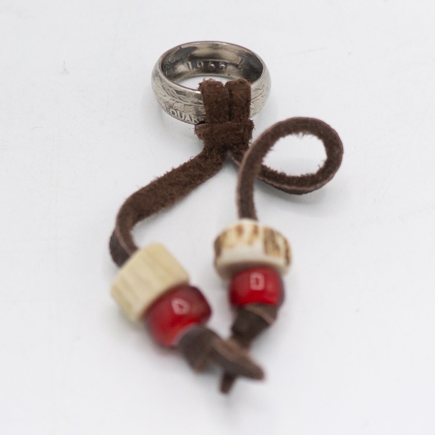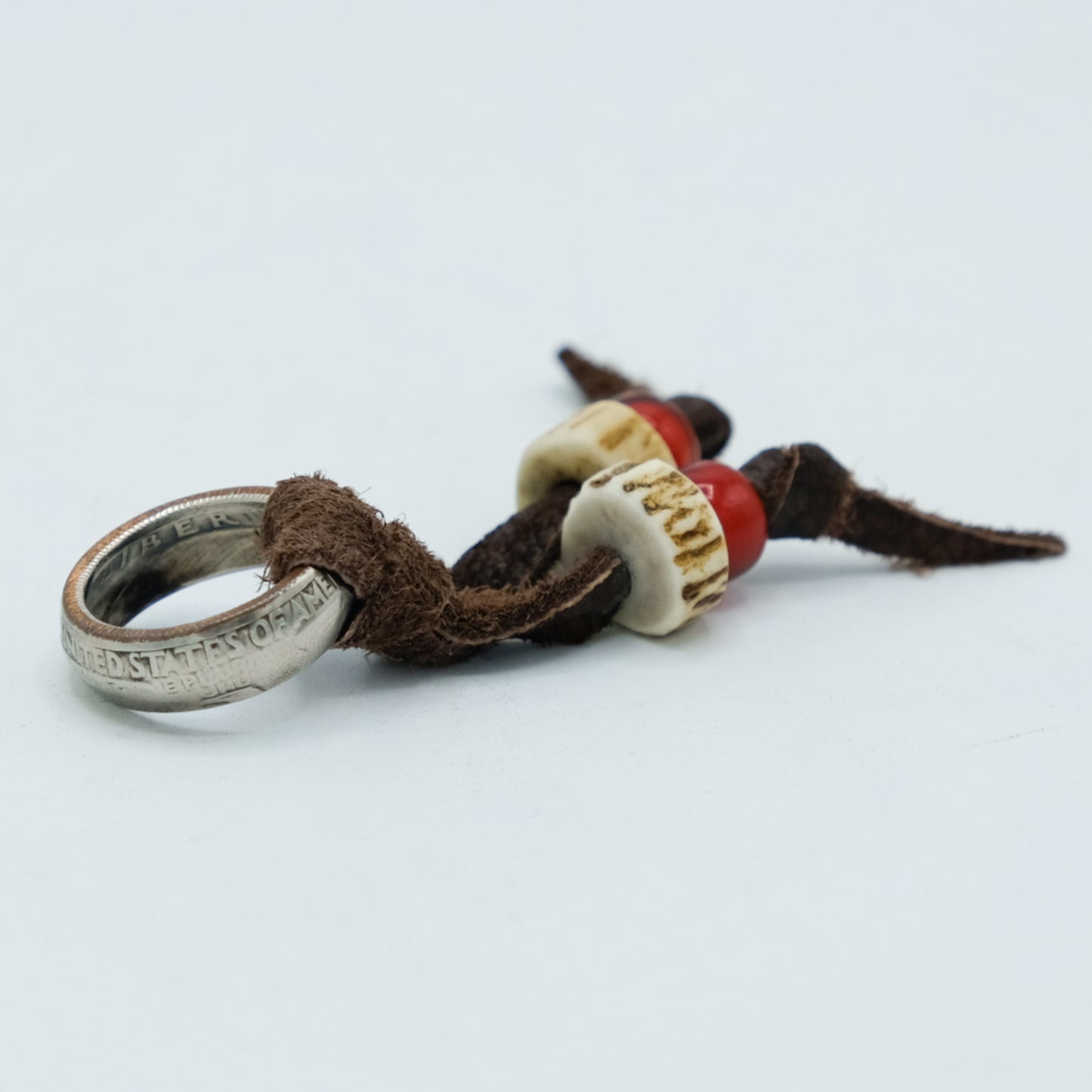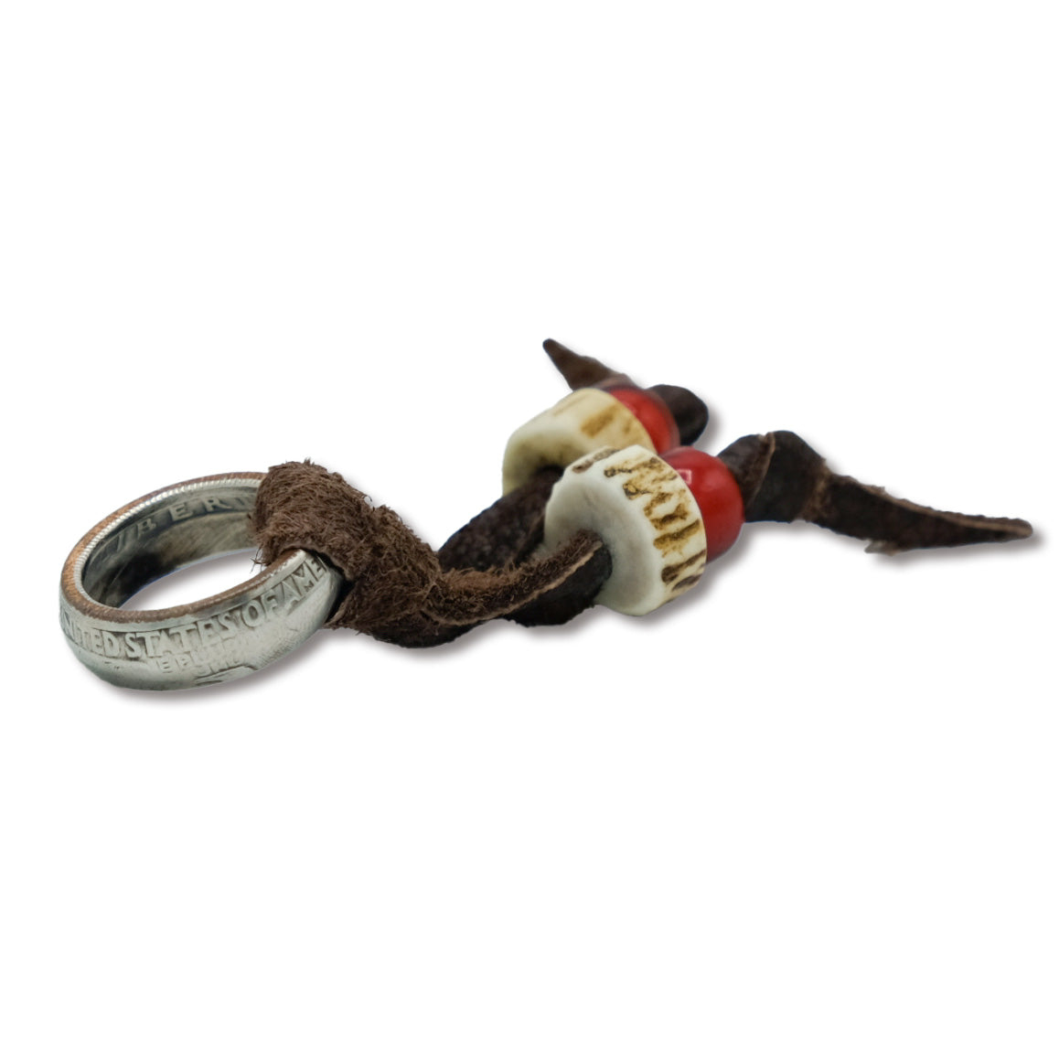 NIXON handcrafted American 25-cent coins into rings, and added Tenryu deerskin string, deer antler beads, and white heart beads as accents to create this scarf ring.