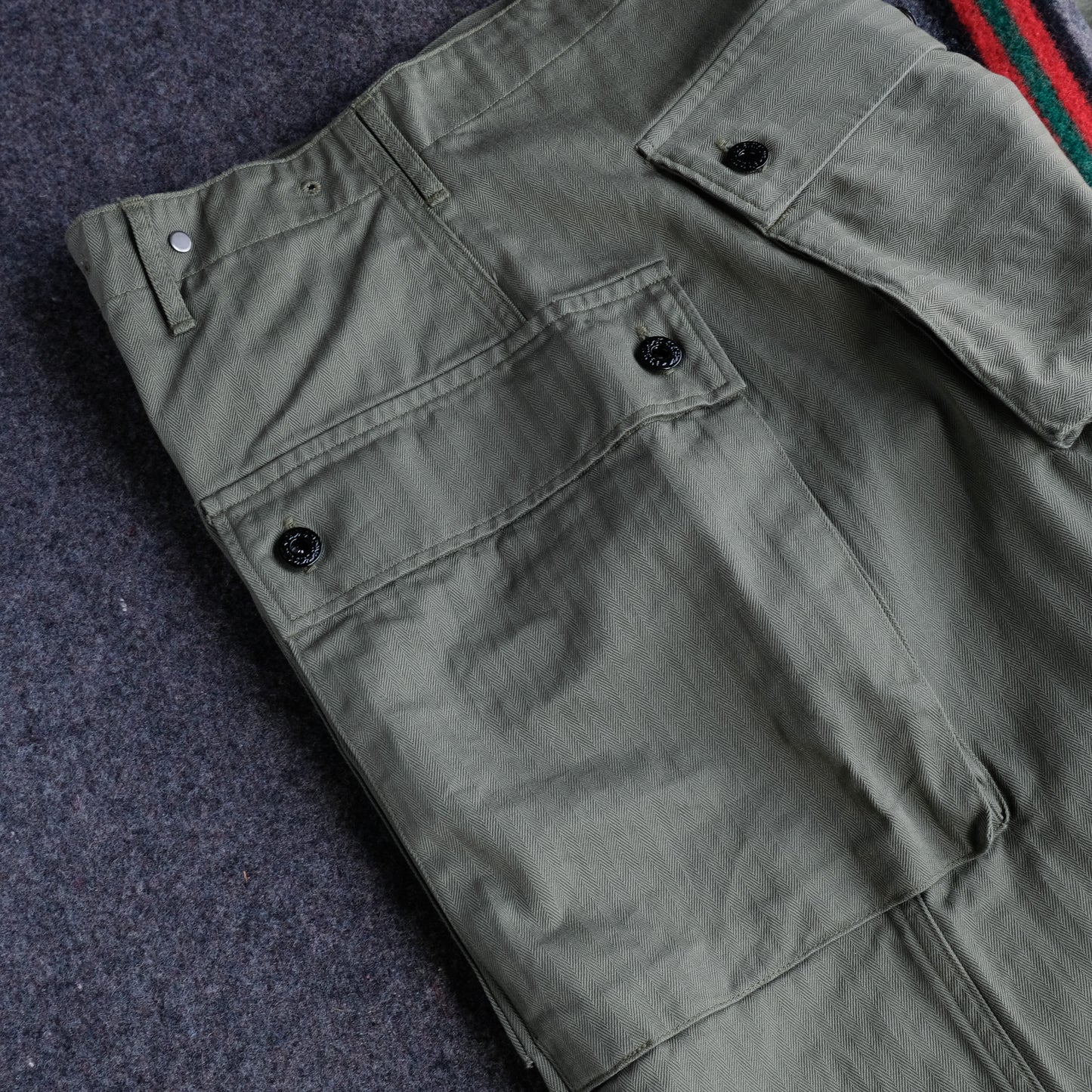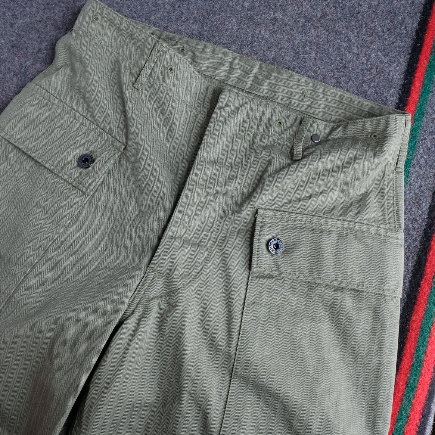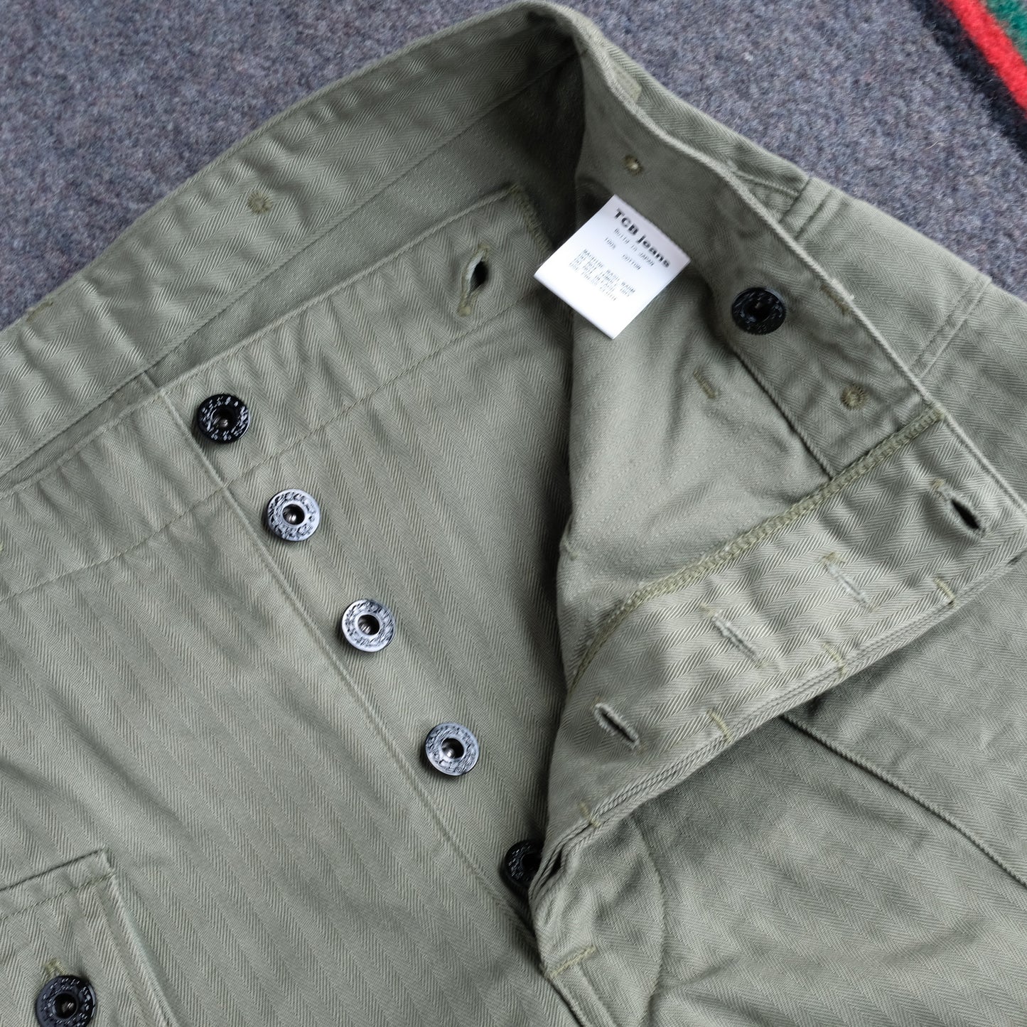 These pants are modeled after the vintage 40's USMC (US Marine Corps) M-44 trousers, commonly known as monkey pants, that TCB owns.