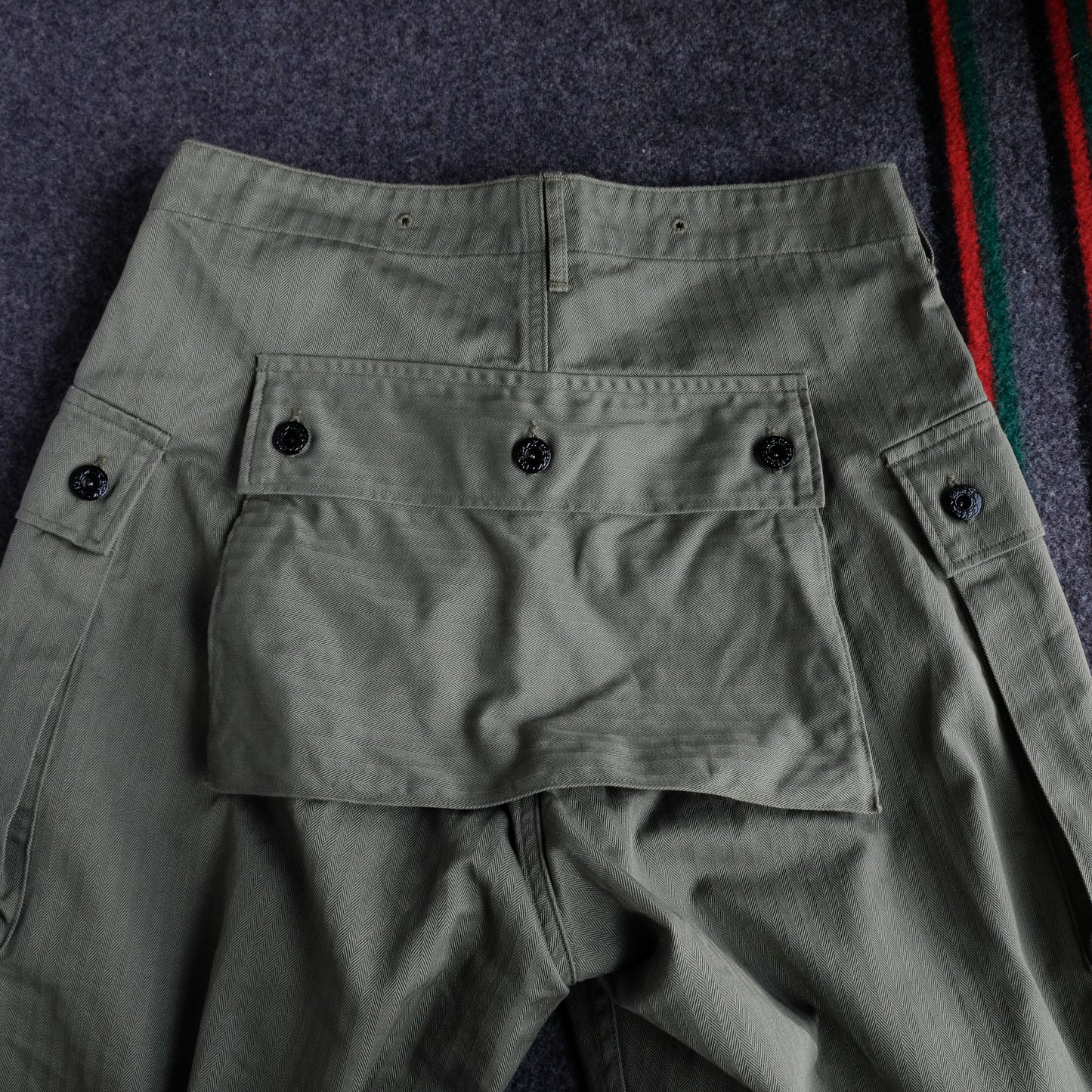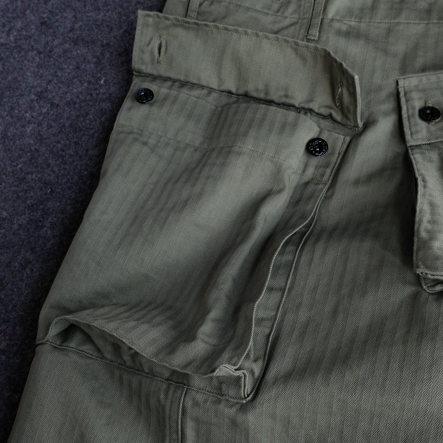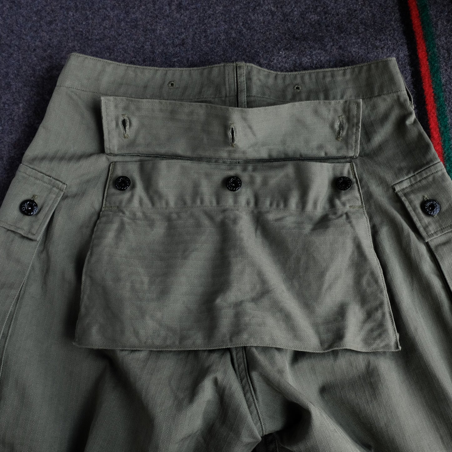 The distinctive large back pocket was used to store grenades and food, and the design was intended for field use, anticipating crawling and forward-leaning postures.