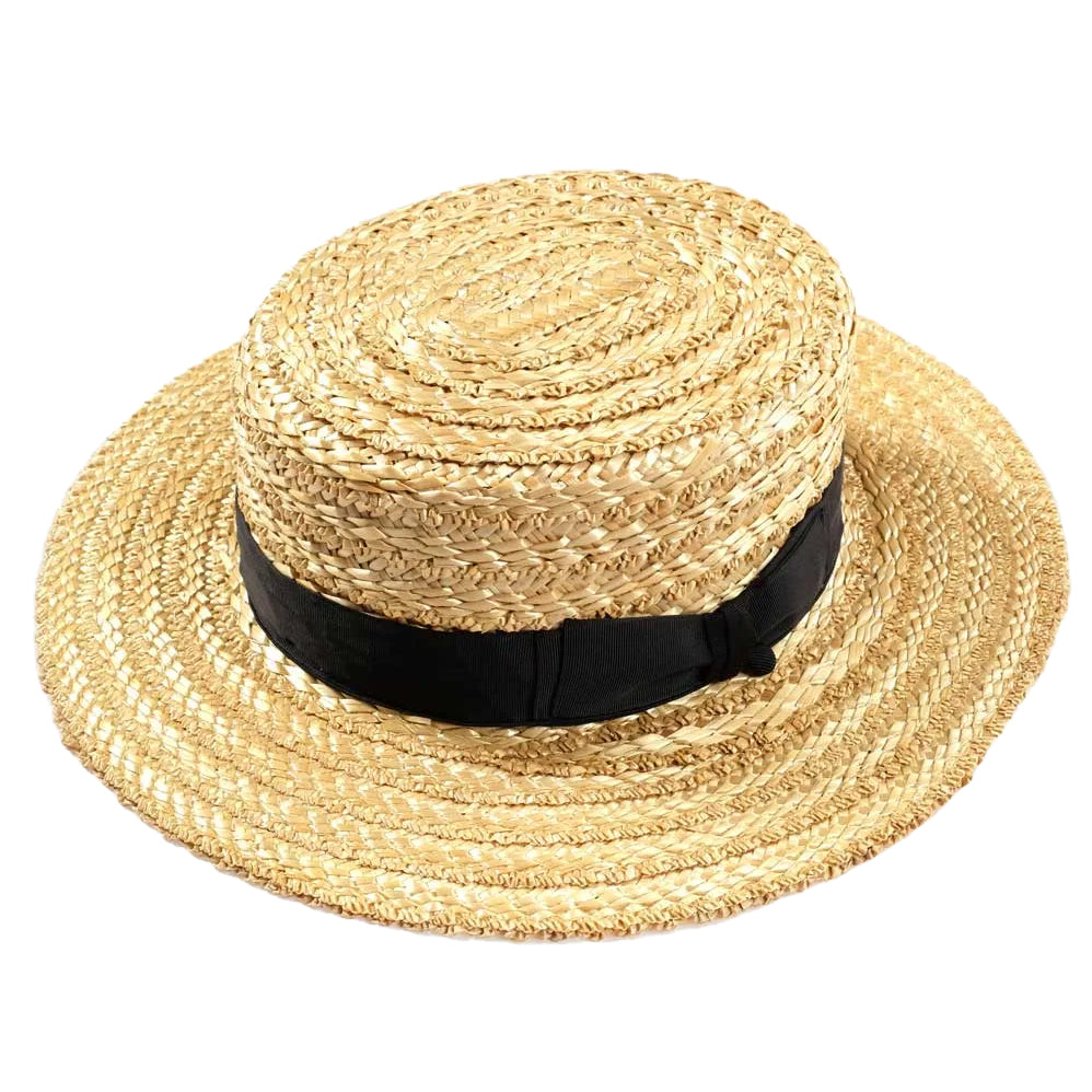 This boater hat is made from vintage wheat braid. It has a slightly glossy, smooth and firm texture. The shape is slightly shallow, giving it a clean look. It is a high-quality design with a silk x linen mesh lining.