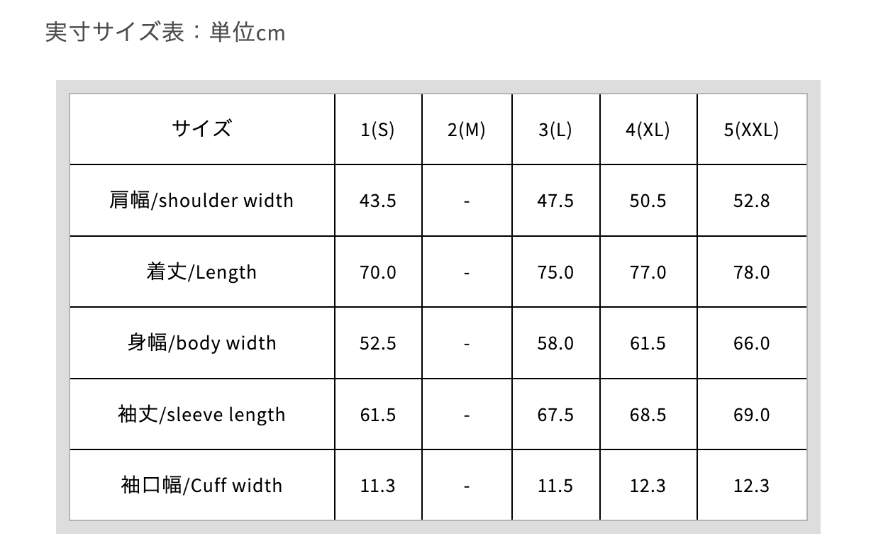 | Size | 1(S) | 2(M) | 3(L) | 4 (XL) | 5 (XXL) |
