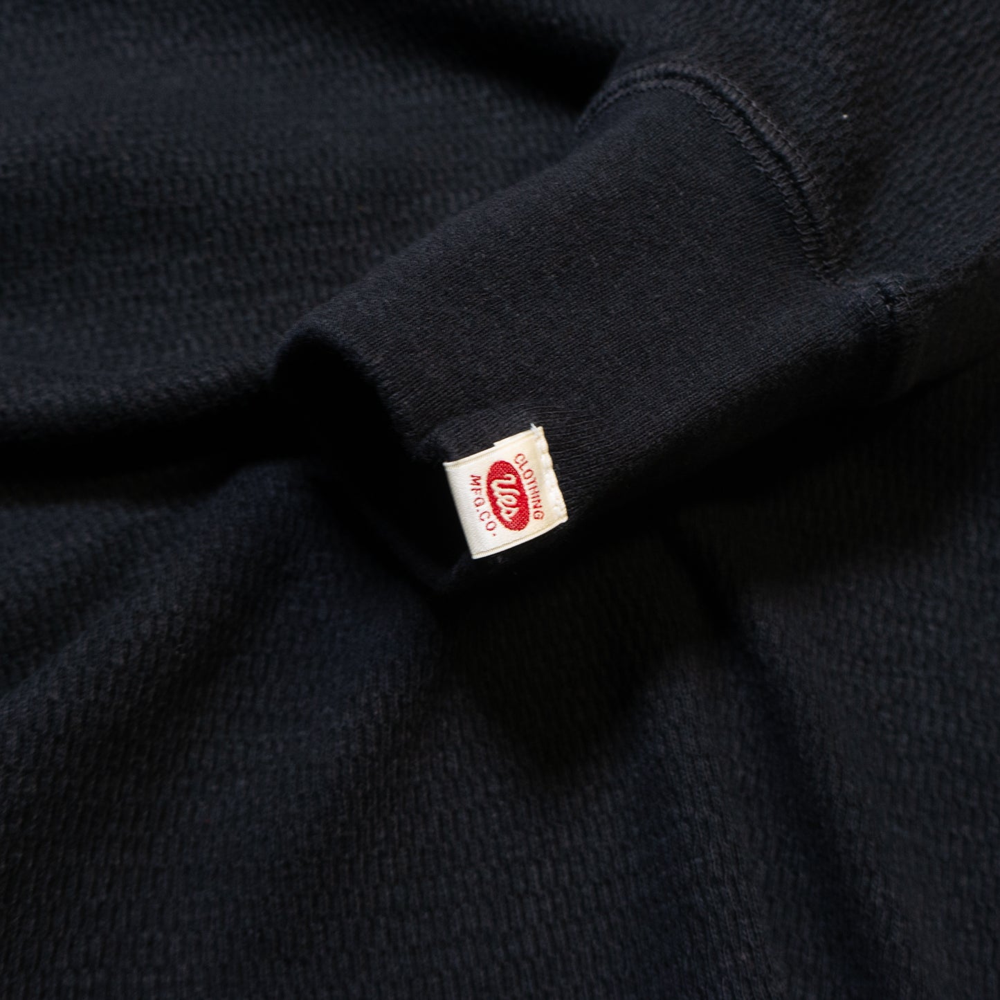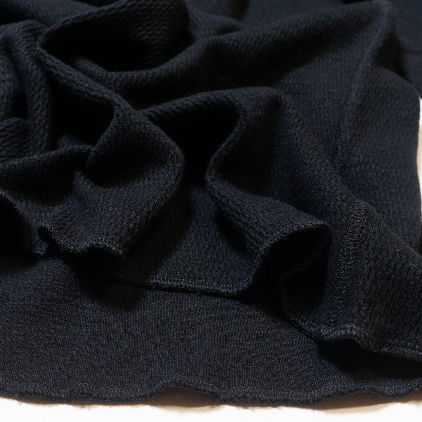 The yarn that makes up the fabric is made from recycled cotton waste and is spun into yarn, giving it a natural uneven texture. The moderately thick fabric fits comfortably to the body. It feels dry to the touch at first, but becomes softer the more you wash it. The honeycomb structure of the knit traps warm air, making it warm and comfortable to wear. It is sewn using a three-needle sewing machine, which makes it durable and the seams add an accent to the design.