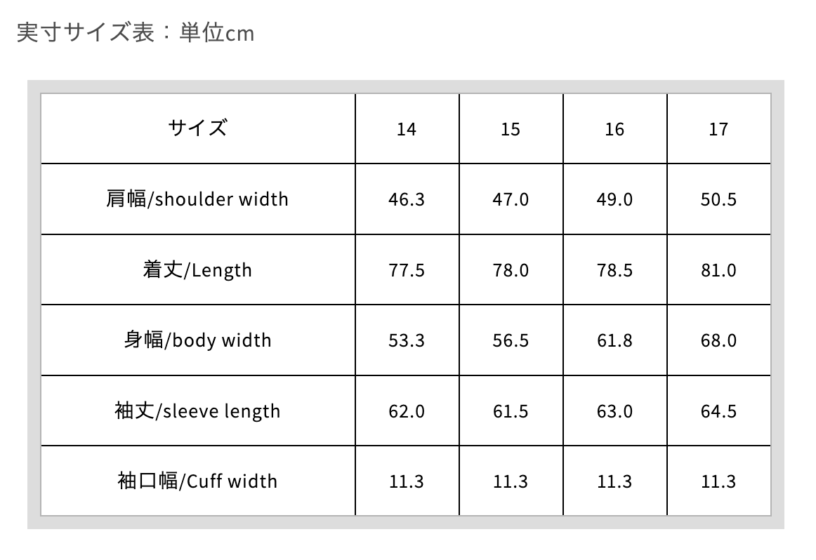 | Sleeve length | 62.0 | 61.5 | 63.0 | 64.5 |