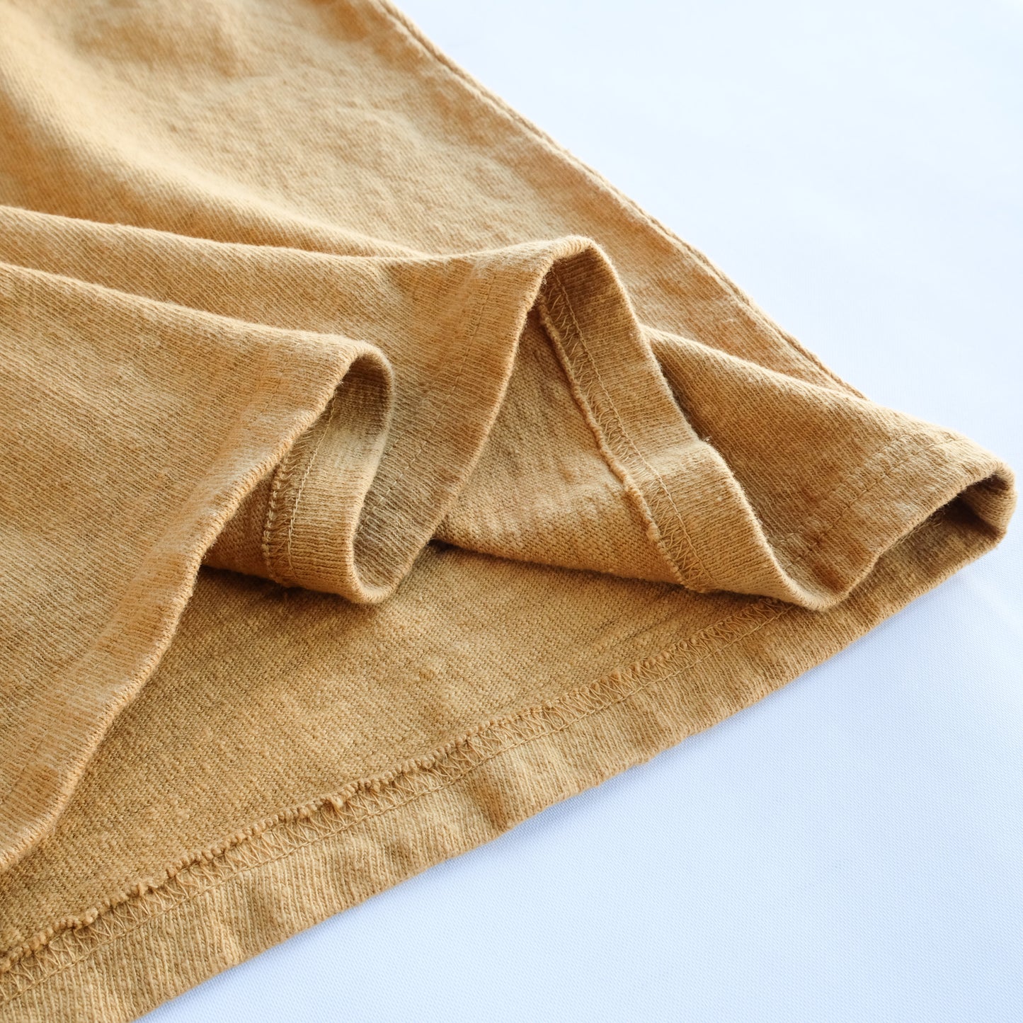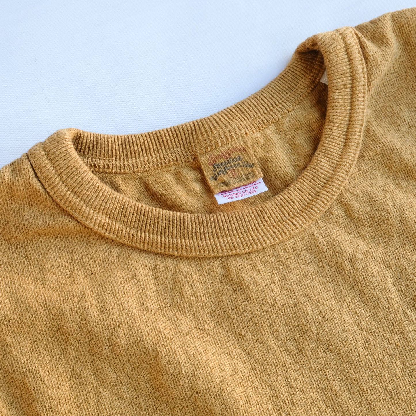 The fact that threads of different colors are attached or mixed in in places on the fabric is a result of mixing in 60% cotton waste, and is not a defect. The thickness of the thread is about twice that of the UES Ramayana T-shirt, so it has a firm texture. We also offer a long-sleeved version made of the same fabric.