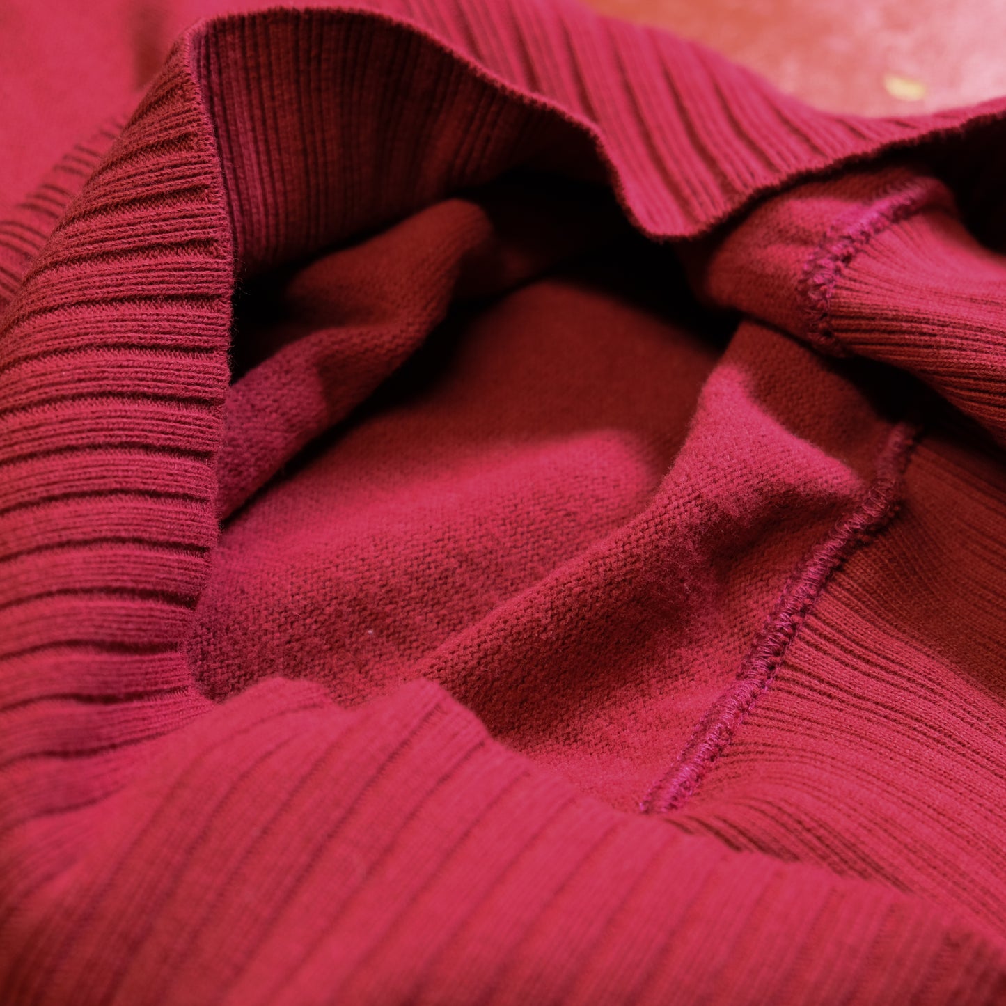 The ribbing, the number of needles removed, and the more clearly unevenness that appears, the more sweater-like it looks. The more needles removed (the more unevenness there is), the better the stretch, but the weaker the bounce back. Find the right balance by removing the needles.