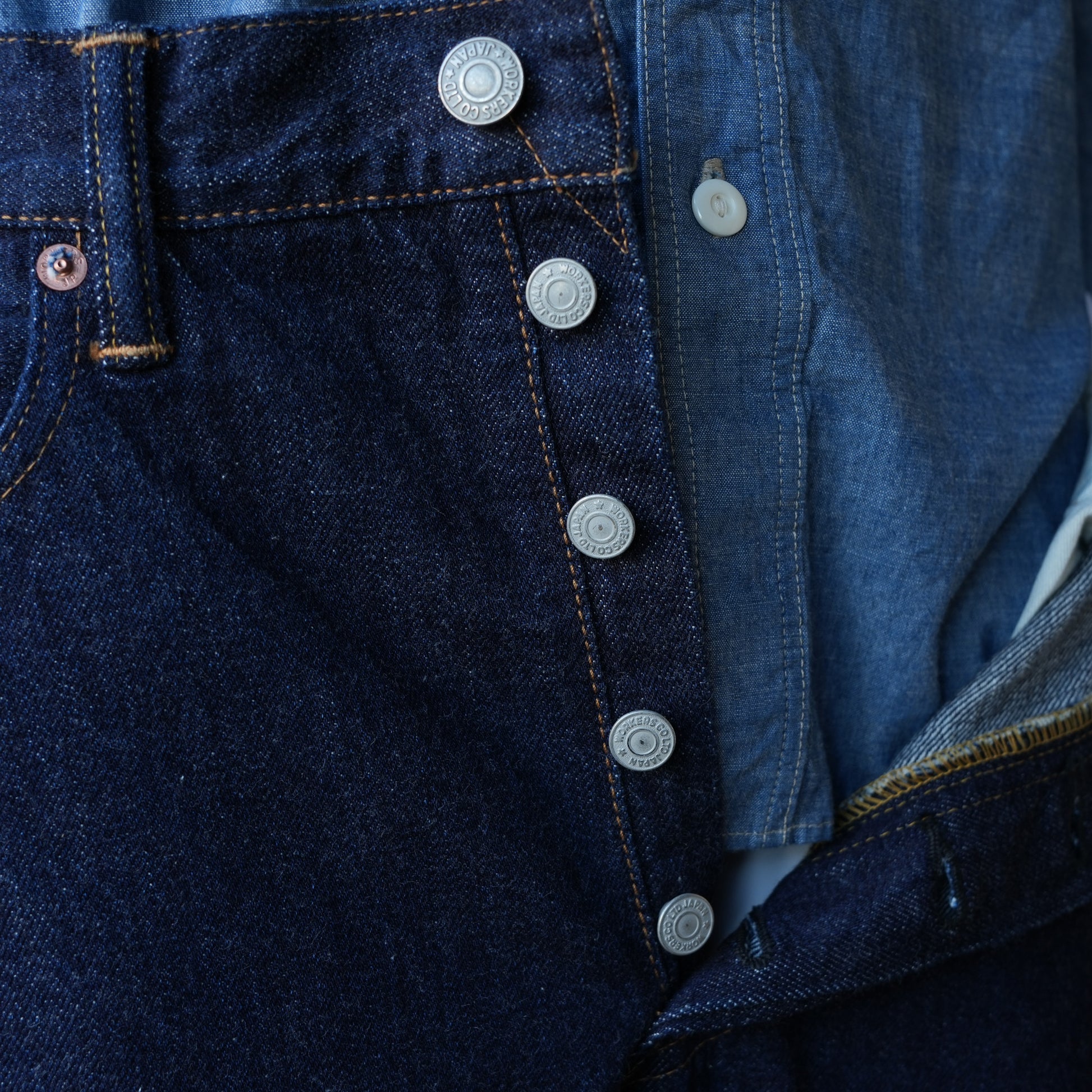 パターンはストレートLot801とスリムテーパードLot802の二型。 裾から10センチ程度は裾幅を同寸にしているので、レングス30インチ程度までは裾上げしても裾幅が変わりません。 縫製はすべて綿糸。脇の割、左右の身頃を合わせる通称「小股」、ヨーク、帯付けは太番手の糸を使っています。綿糸で強度を出すための仕様ですが、これが結果としてセルビッジのデコボコとしたアタリ、ヨークの強いパッカリングを生んでくれています。 今回、0から生地を作りジーンズを作るため心がけたのが「ベーシックであること」。綿はクラシックな雰囲気を醸し出すため、ペルーやインドなど、米綿以外を混ぜる方法もあります。インディゴ染めにしても下染めでピュアインディゴとは違う味わいを作り出す方法もあるのですがそれらを行わず、米綿・ピュアインディゴにこだわりました。結果、出来上がった色味は青が強く私のイメージ通りになっています。 原綿の採取地から糸を作る紡績。その後のロープ染色から織る、縫うと工程を下記にて紹介しております。