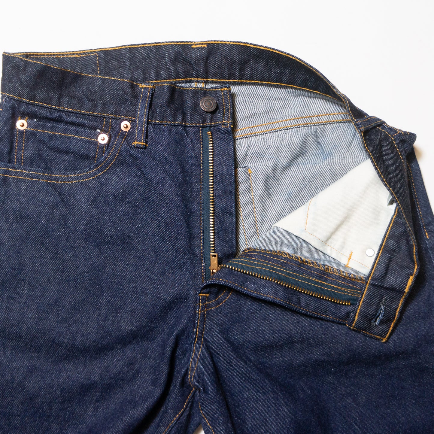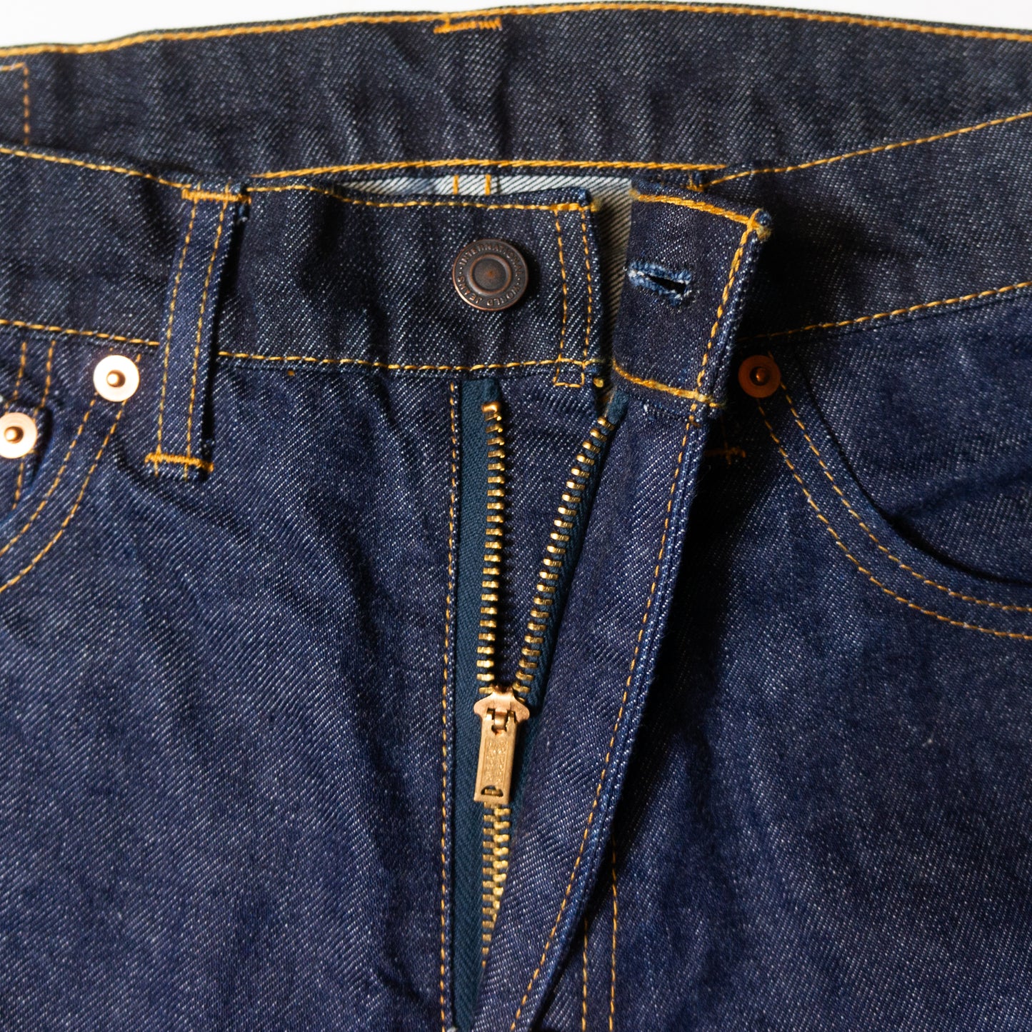 やや細身のストレート、股上はやや深めのジッパーフライ。