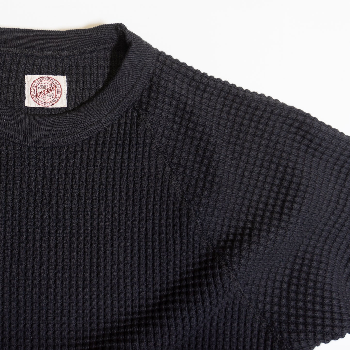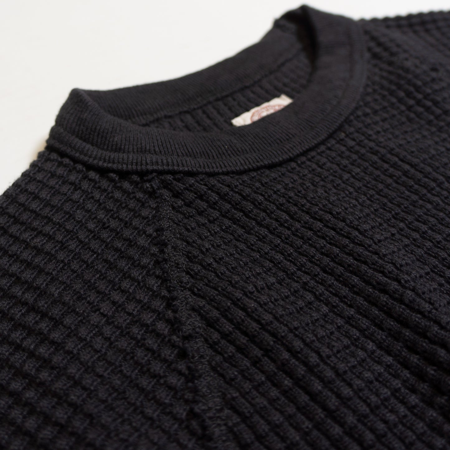 ワッフルというとサーマルのようなスタイルの多い中、ラグランスウェットのようなデザインが新鮮。丈が短めで、太いパンツによく似合います。