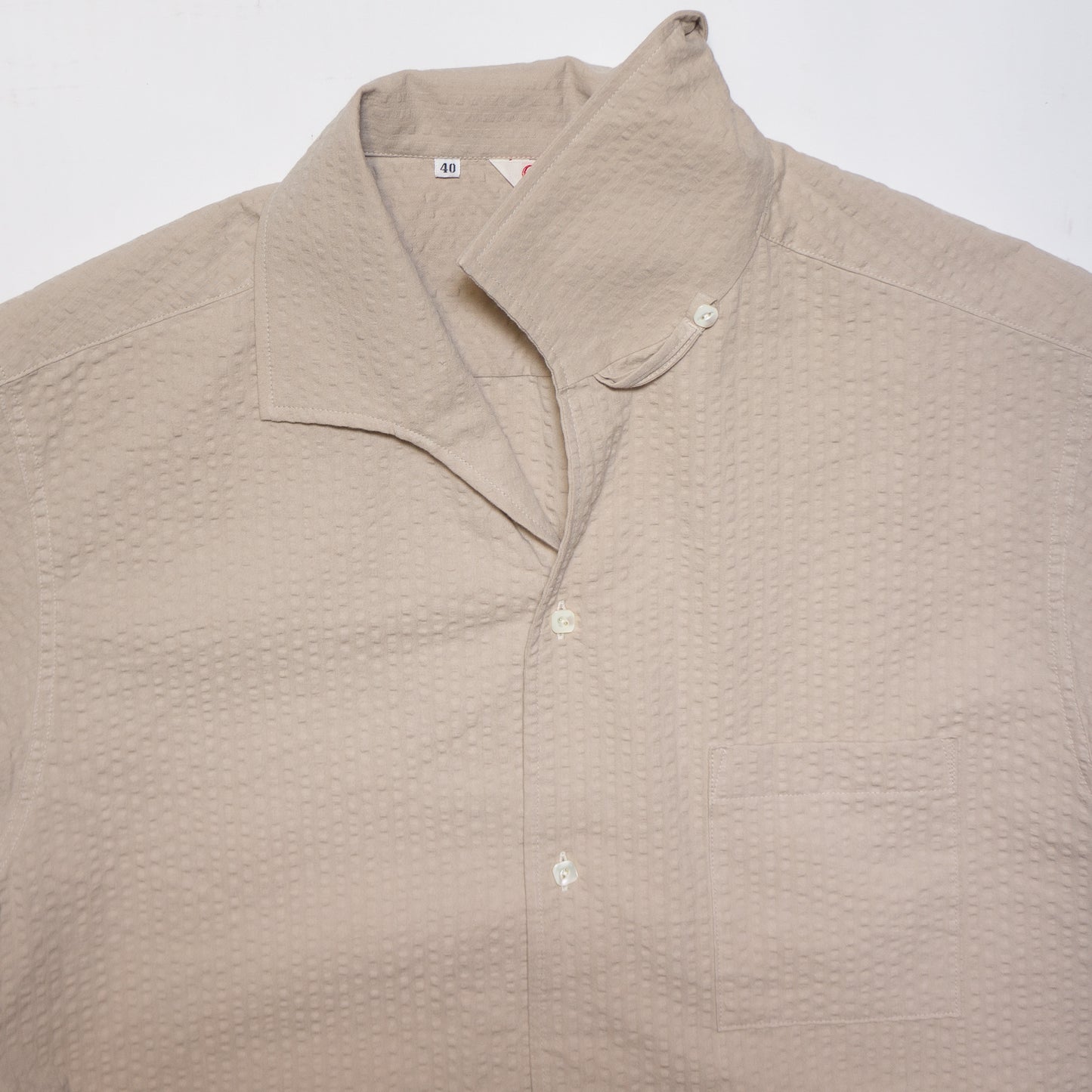 50年代の紳士が好んだスタイルの一つイタリアンカラー仕様のシアサッカーシャツ。チンストライプ付き。ボタンは菱形タイプのシェルボタン。