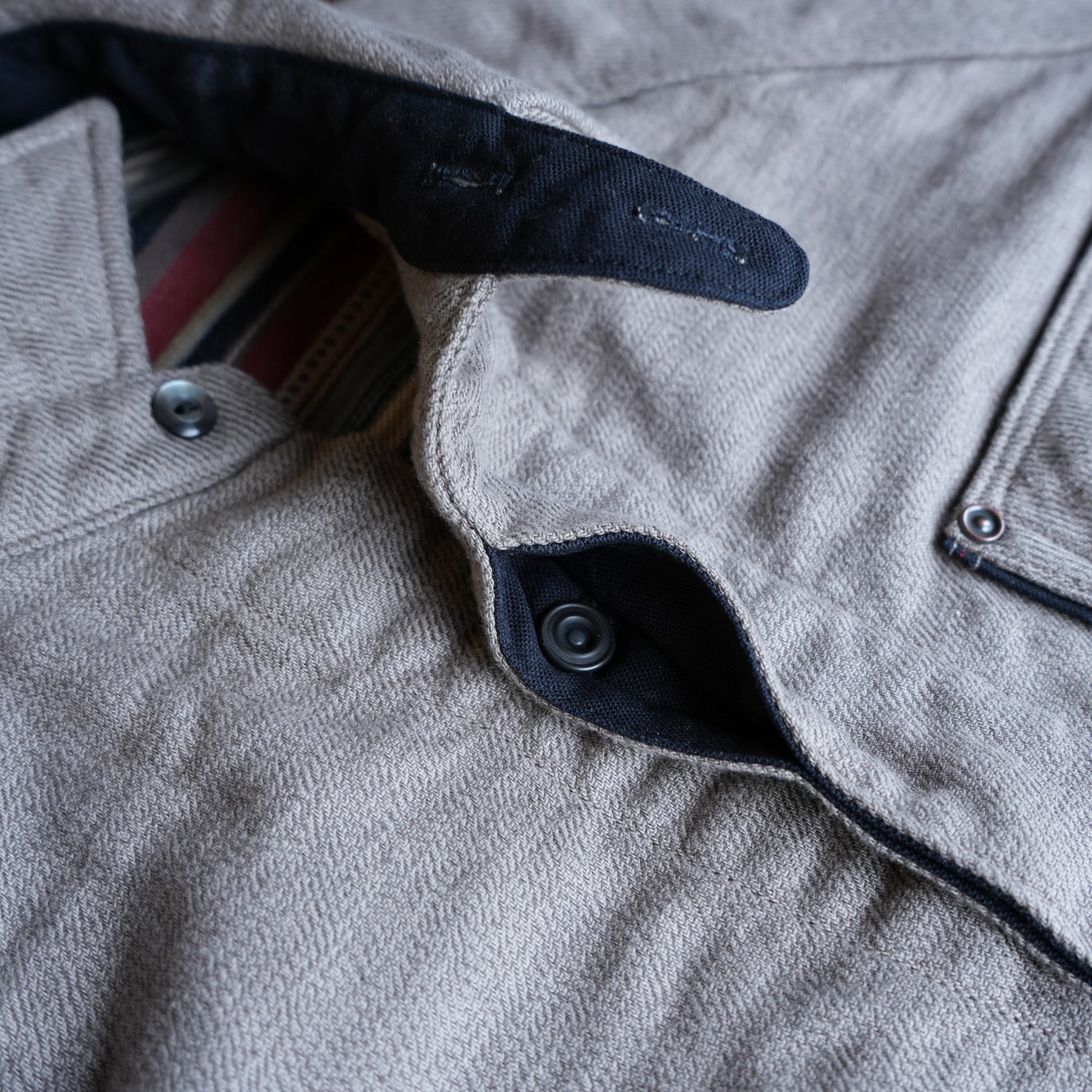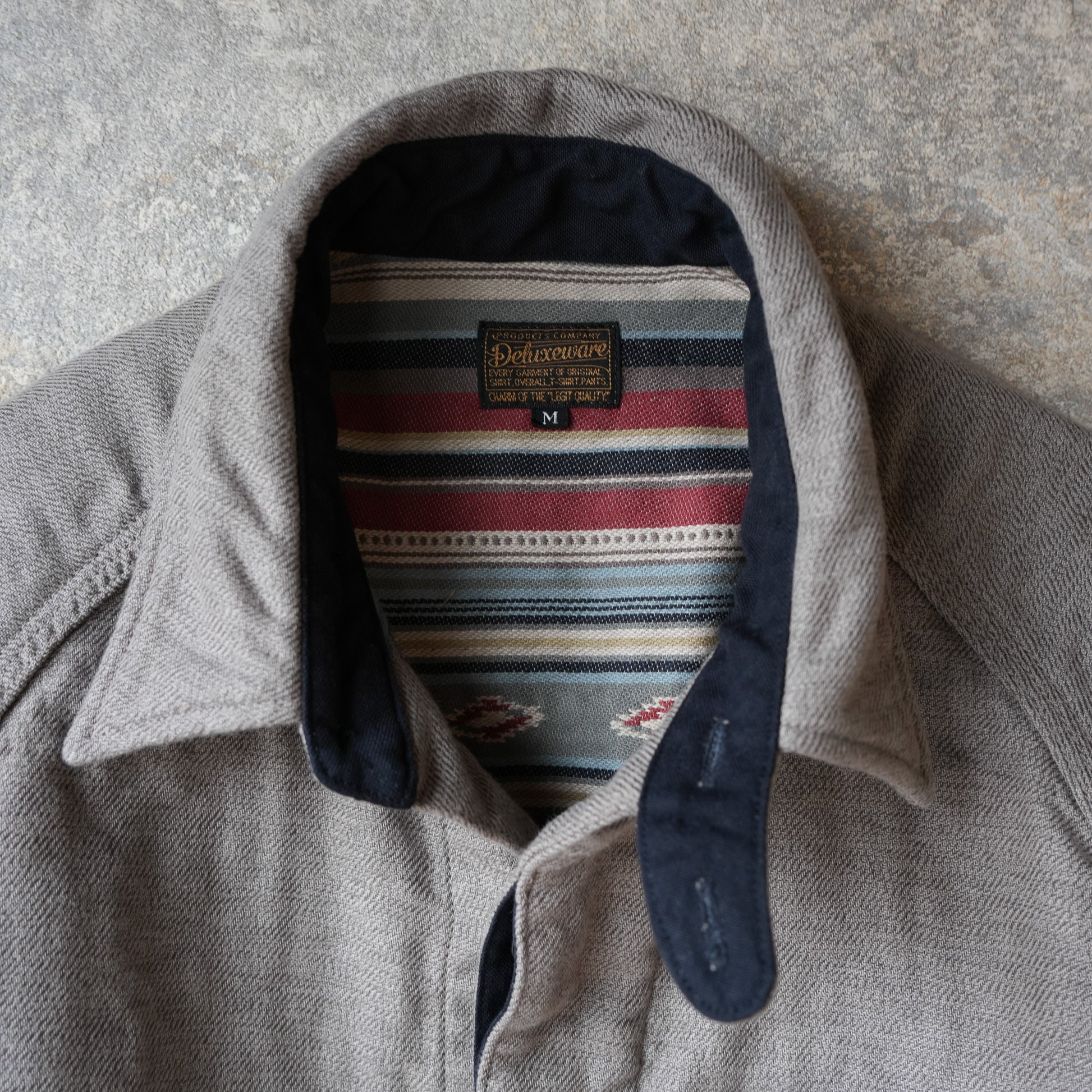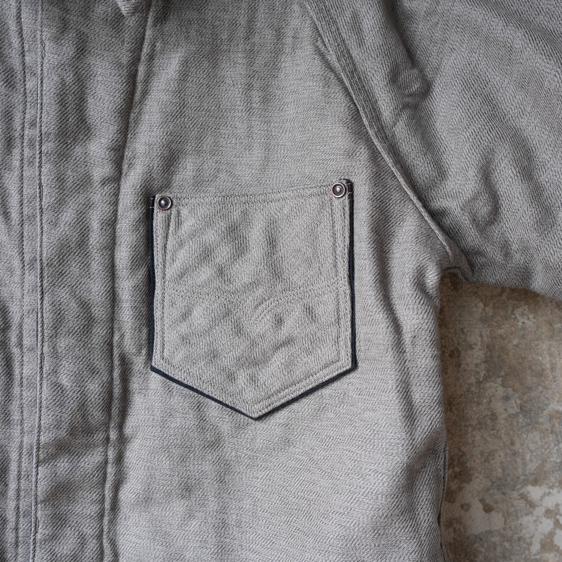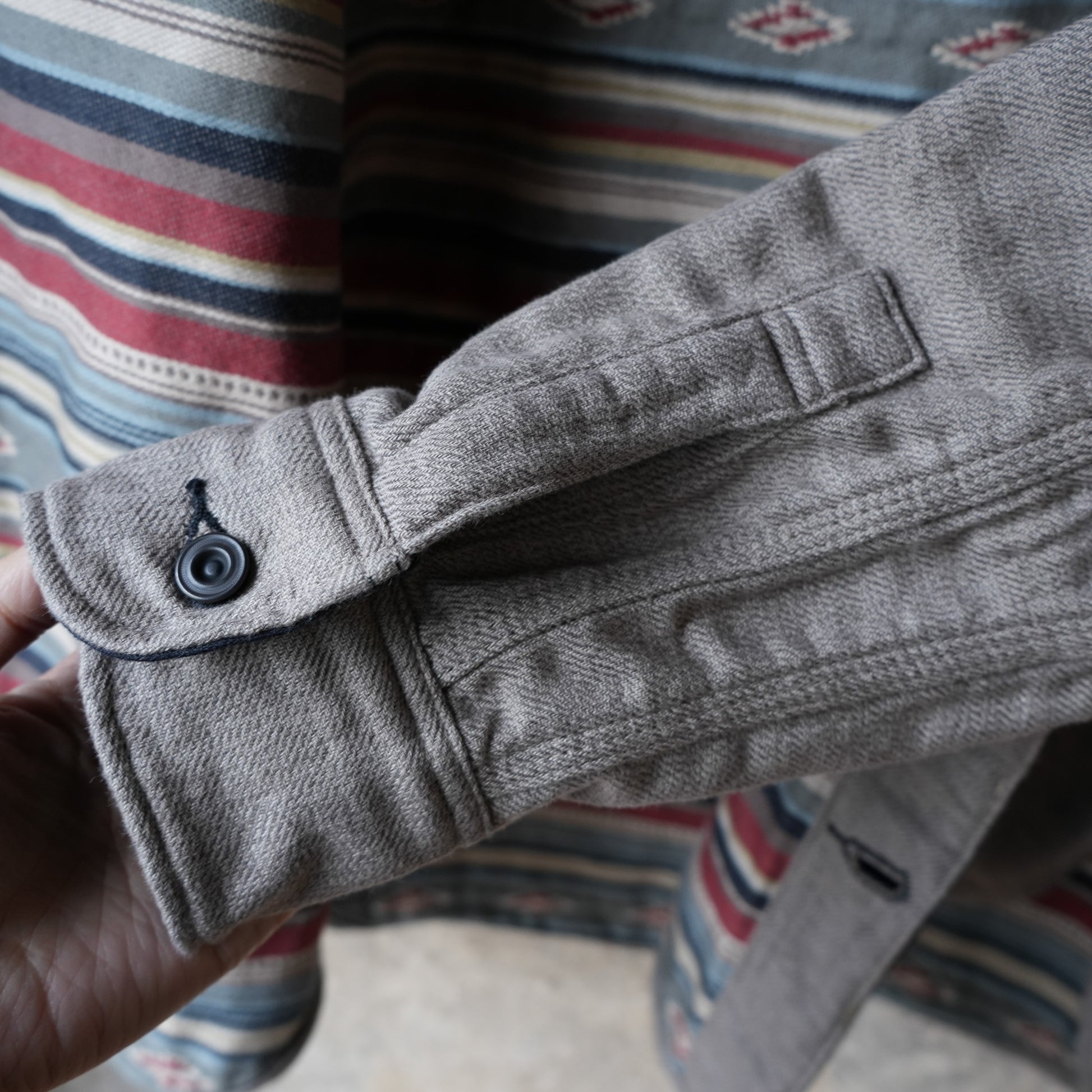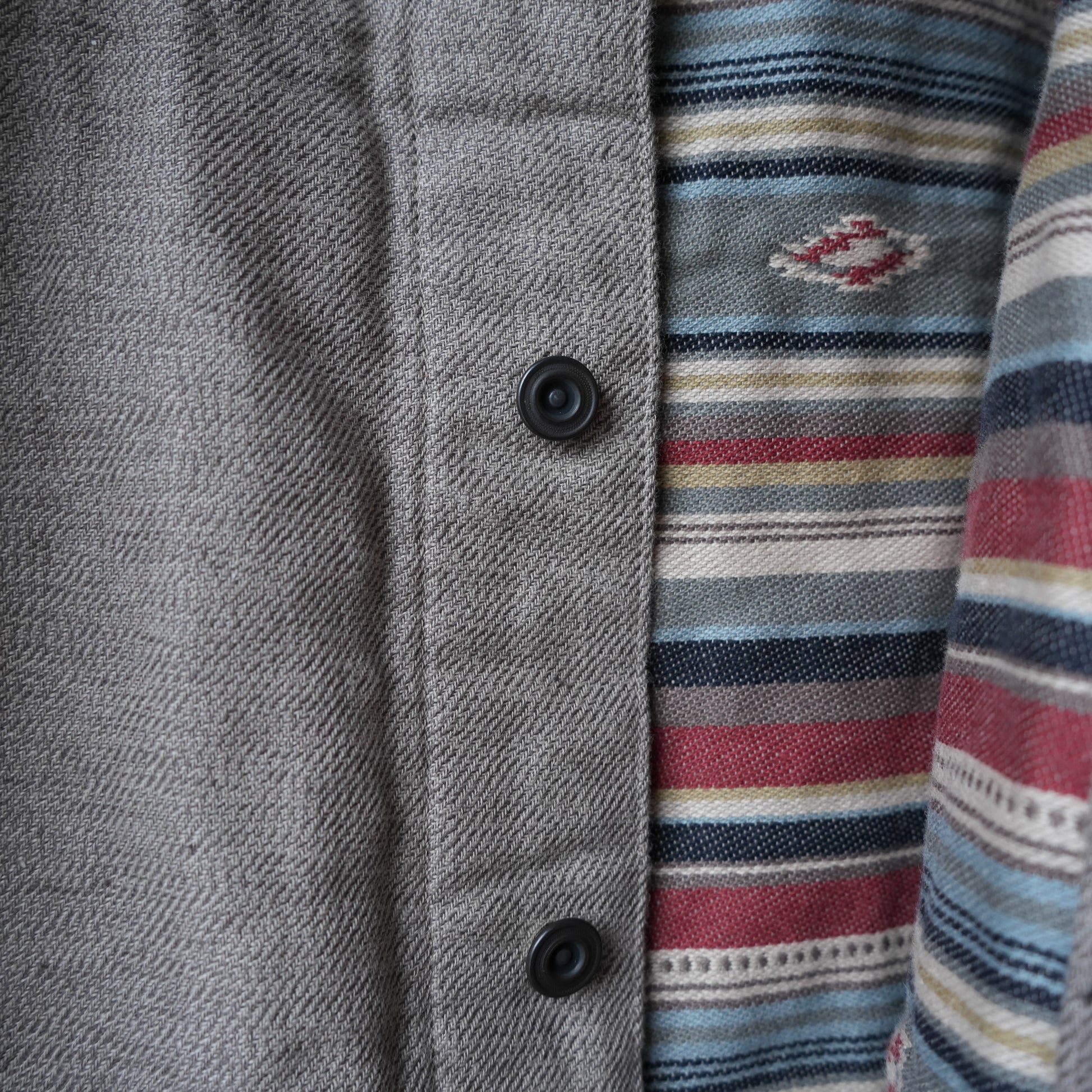 Spiral店頭には表地グレーバージョンを入荷。ちらっと見えるネイティブ柄をお楽しみください。シャツジャケットの作りとなっていますので、急な温度変化に役立つ羽織ものとしても重宝します。