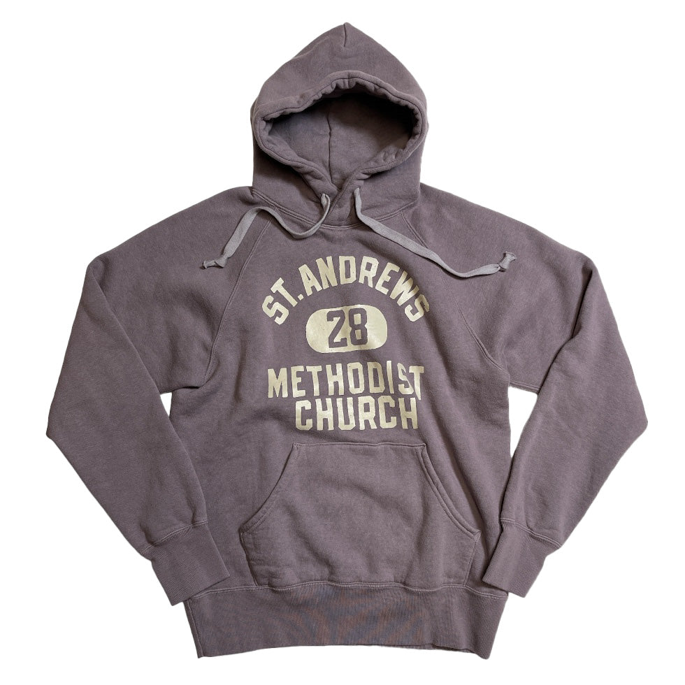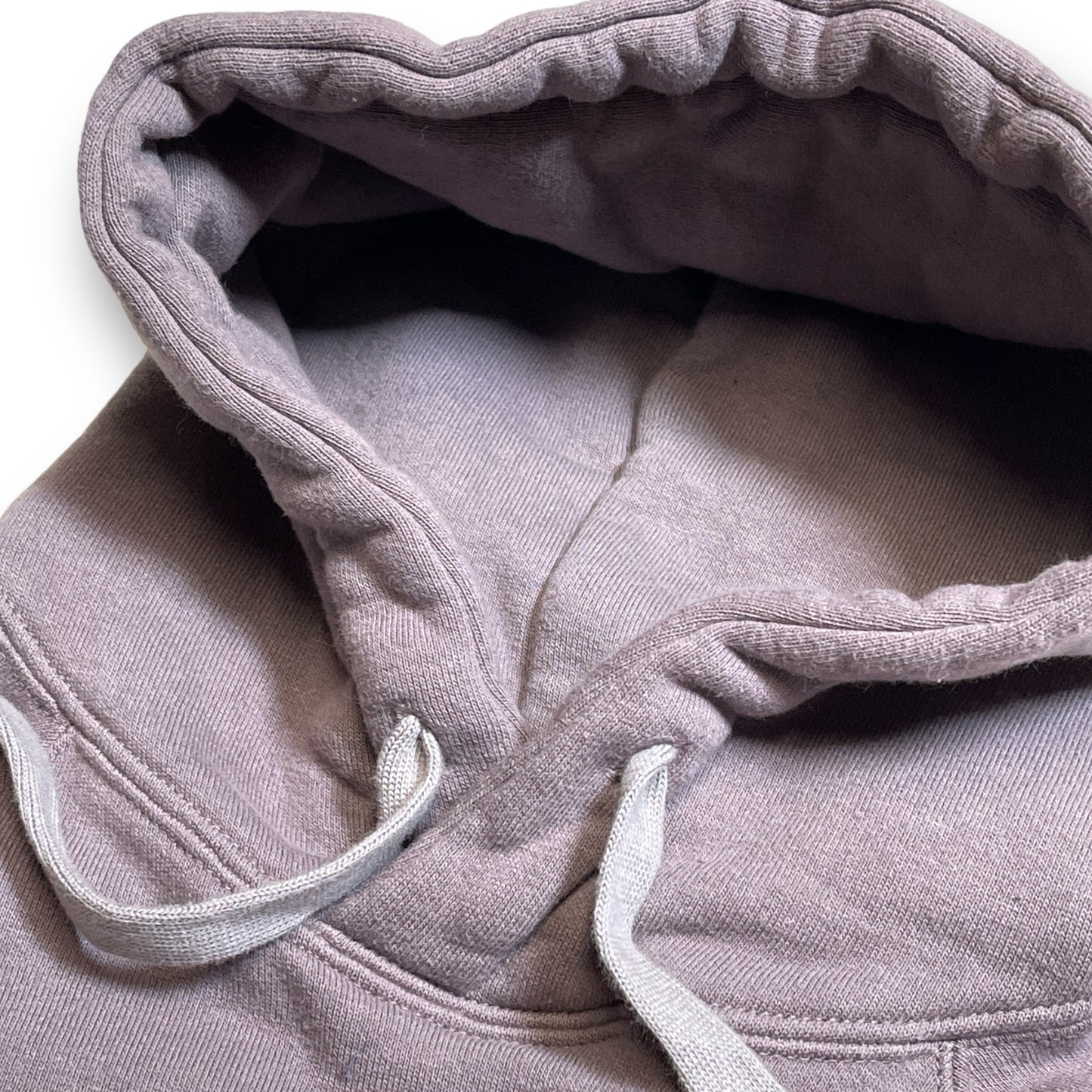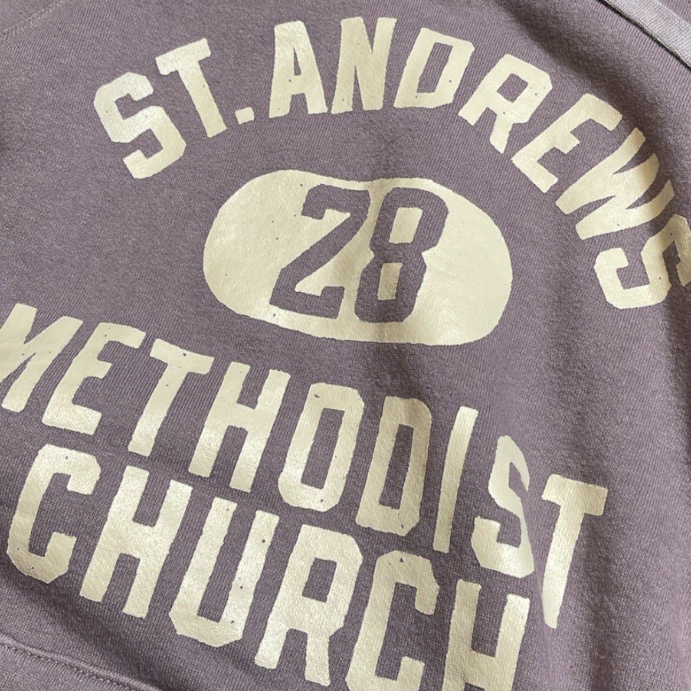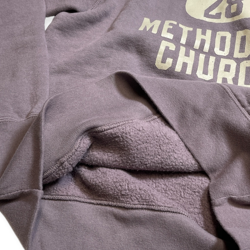和歌山にて旧式吊編機により製造する吊裏毛素材。本来この旧式編機は「フワフワに柔らかく空気を含むように編み上げる特徴」を持ち、旧式編機らしく「柔らかく保温性に富んだ」素材に仕上げました。ローゲージにより空気の含有率が向上することでミディアムウエイトながら保温性を損なわずに編上げました。※フードヒモには特殊な丸編みの平紐が備わる