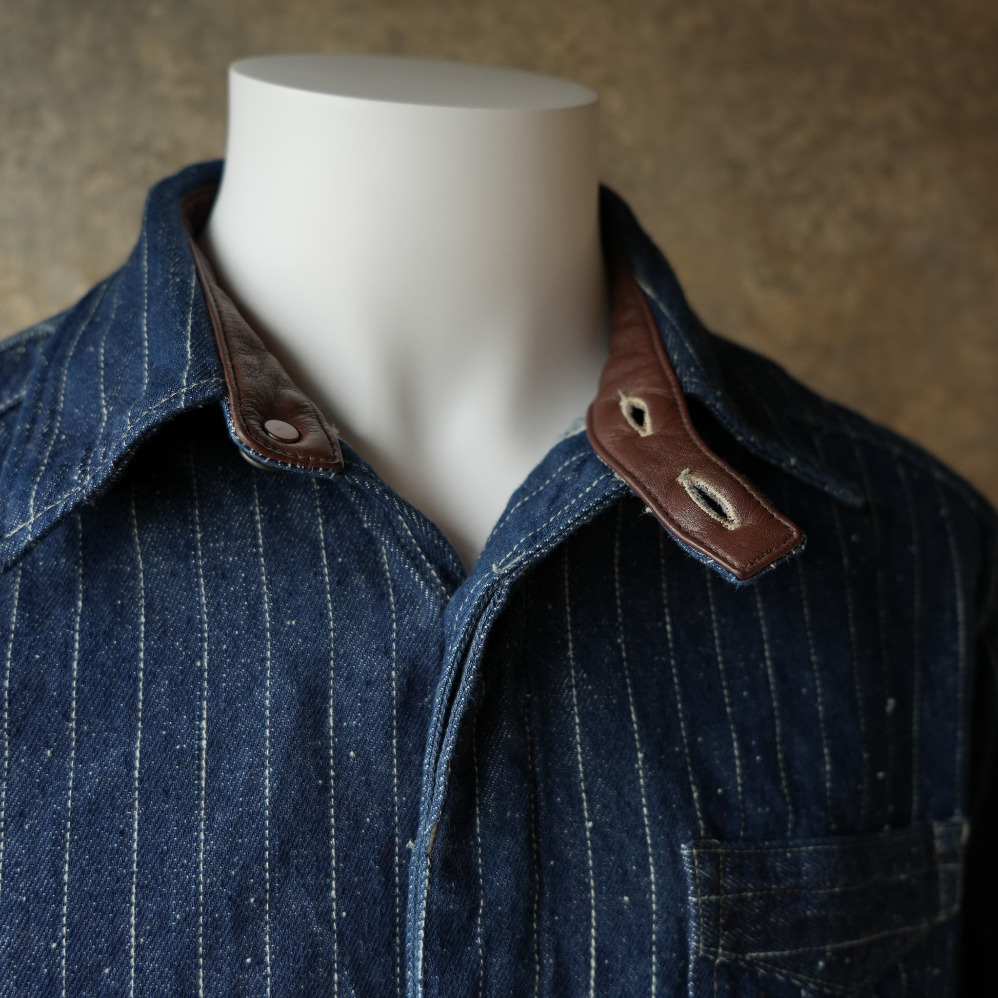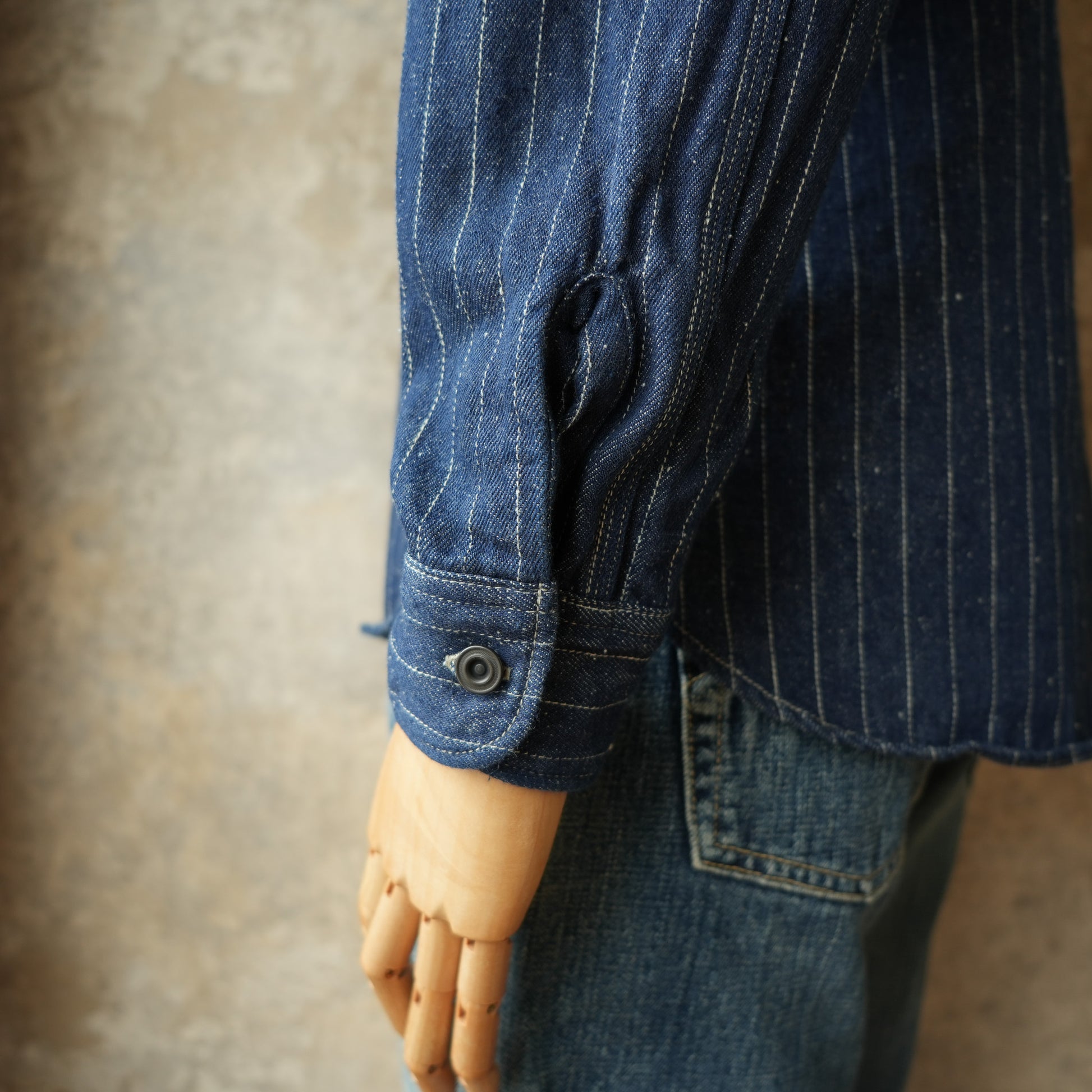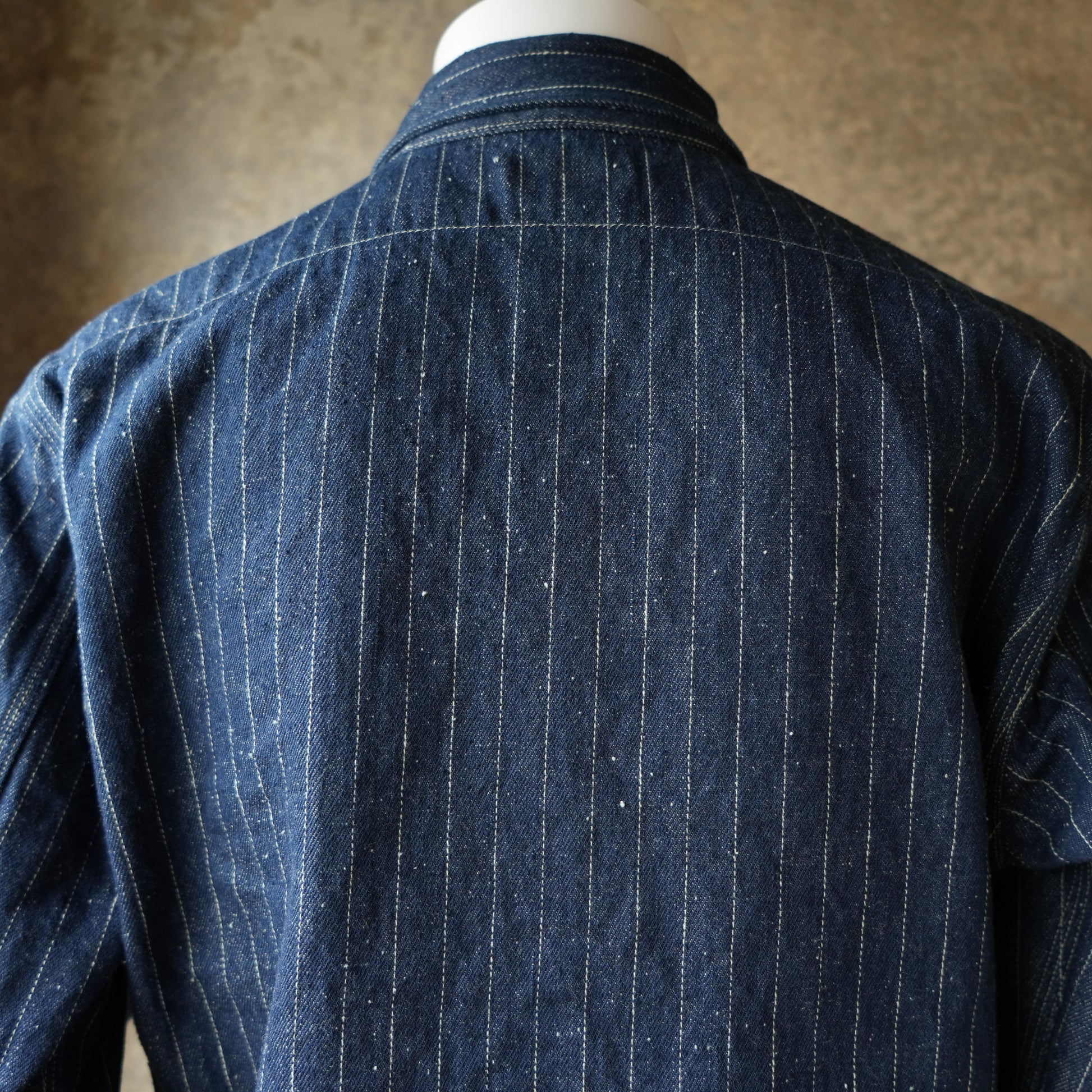 ●素材表示:デニムストライプネル 岡山県井原市で製造したデニムヘビーネル素材。デニムとヘビーネルの融合を謳い、デニム用シャトル機で織り上げたヘビーネルファブリック。その名の通り、デニム組織によるエイジングとヘビーネルの柔らかさと保温性が混在する特別な素材。