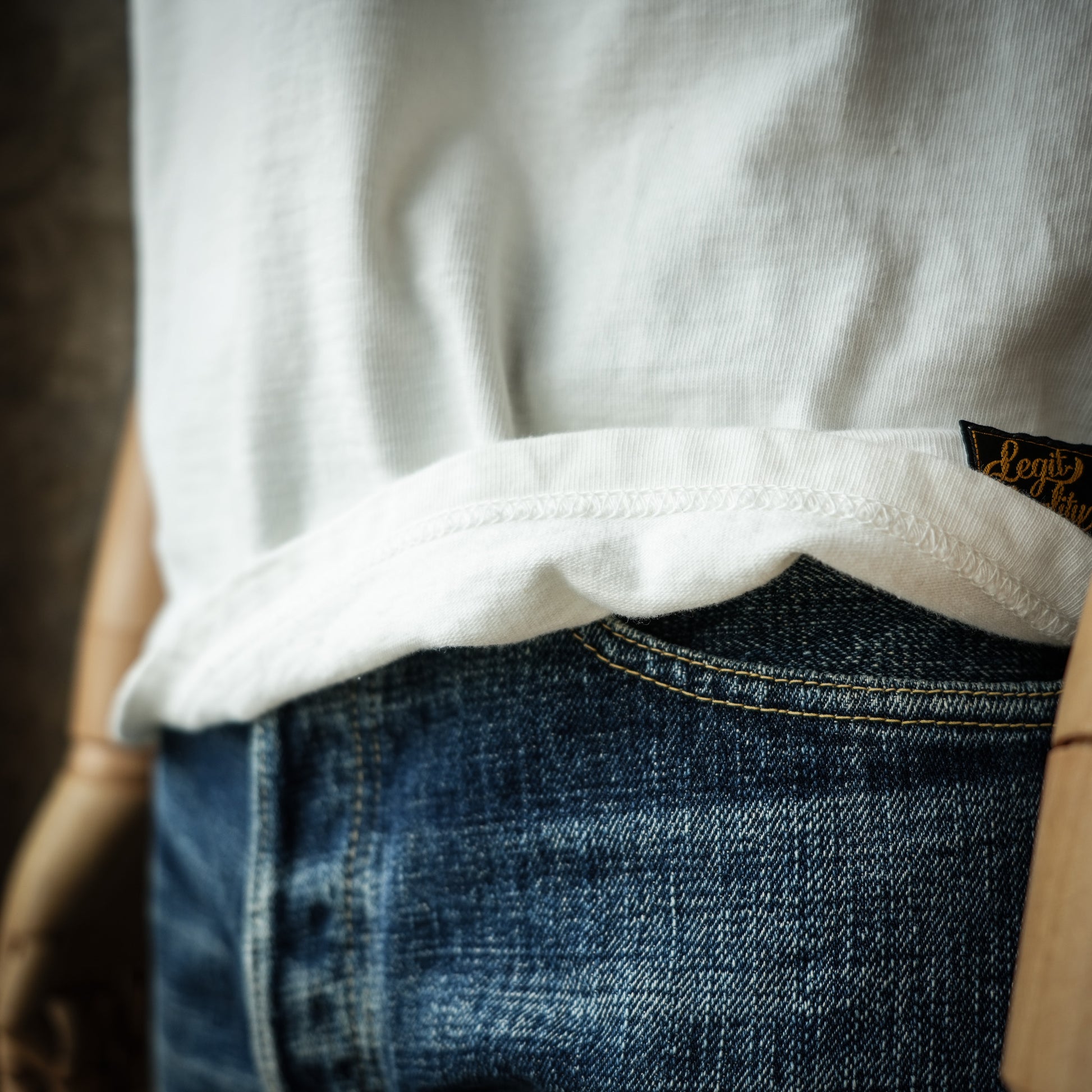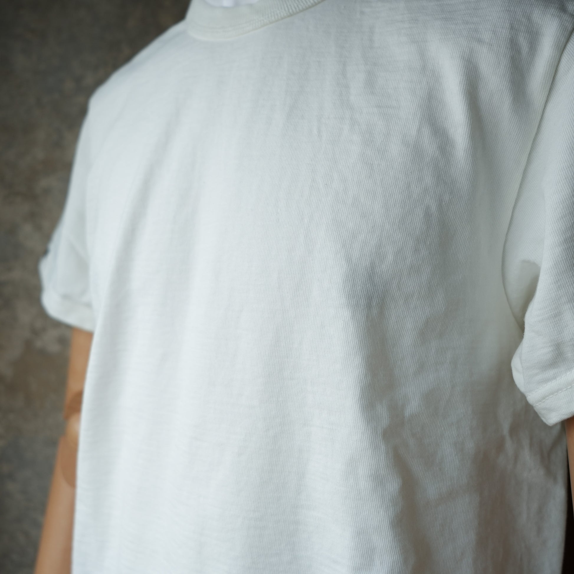 - 旧式吊編機の最高密度から創る吊天竺。1日10m(8着分)の大変非効率な設備とされ、現代機器では真似出来ない素材感が特徴。