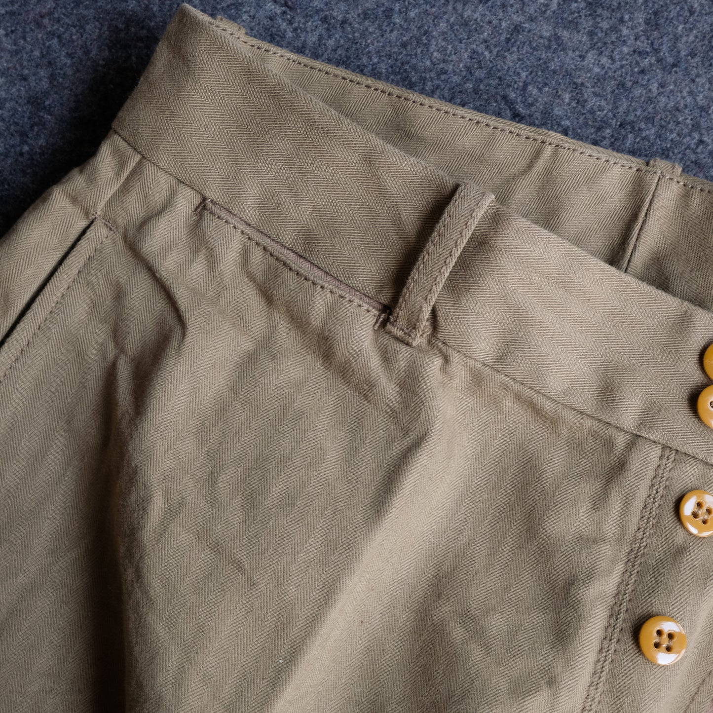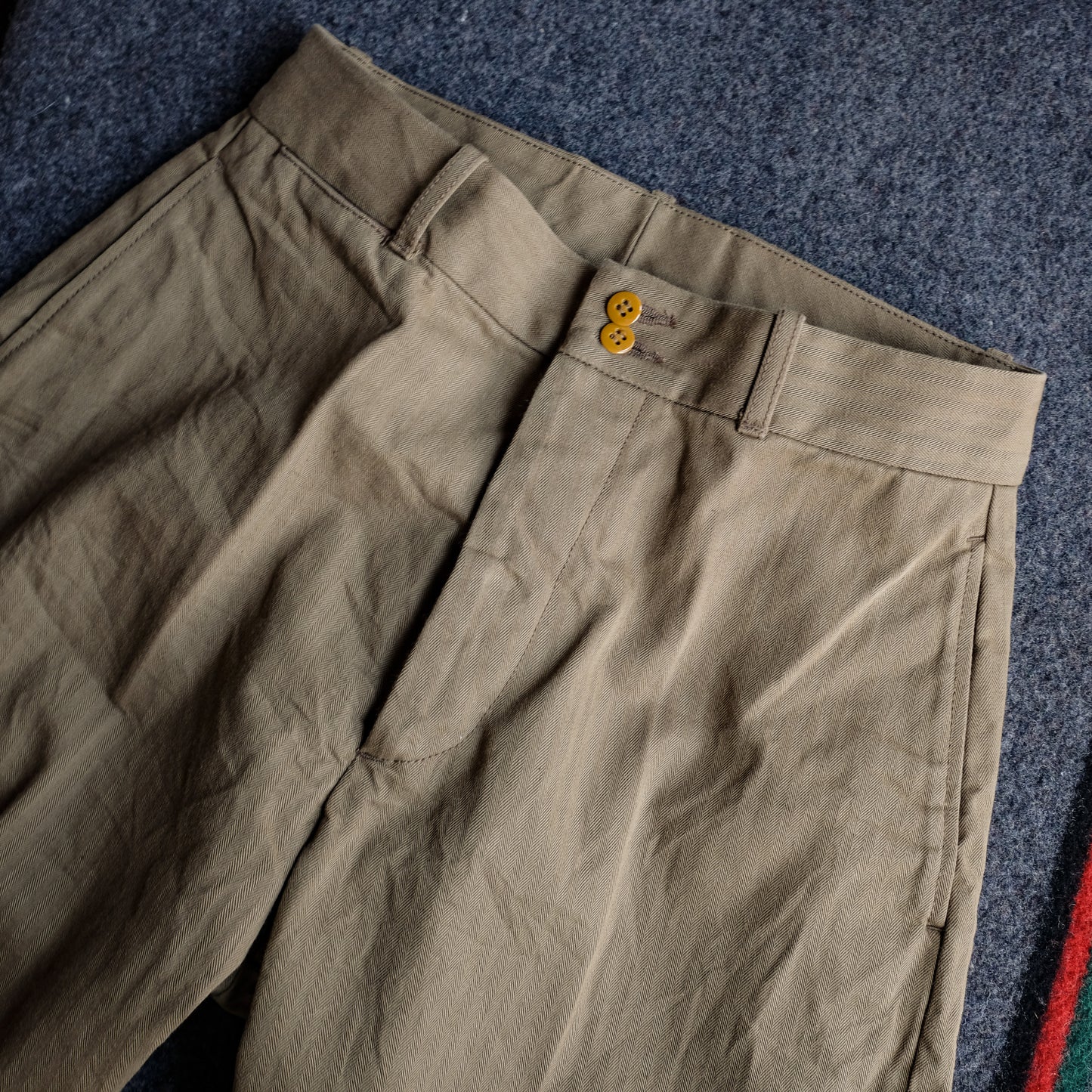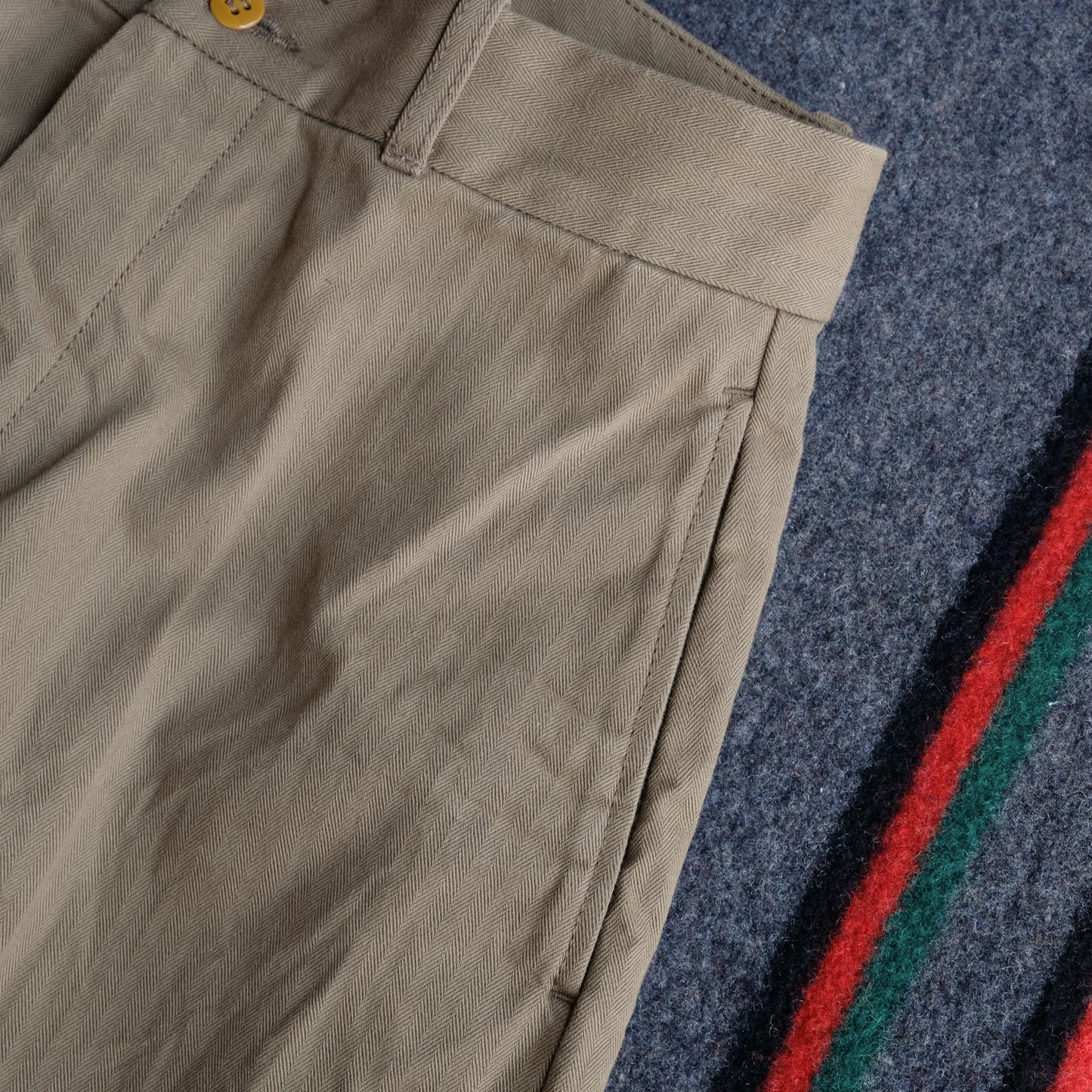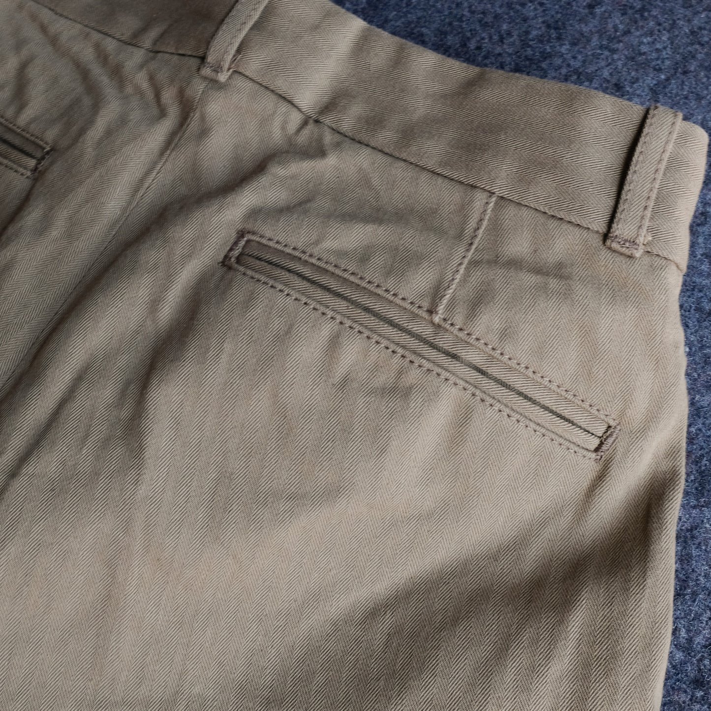 強撚りのコットンヘリンボーン生地のトラウザー。フロントは尿素ボタンフライ。コインポケット付き。ルーズフィット。