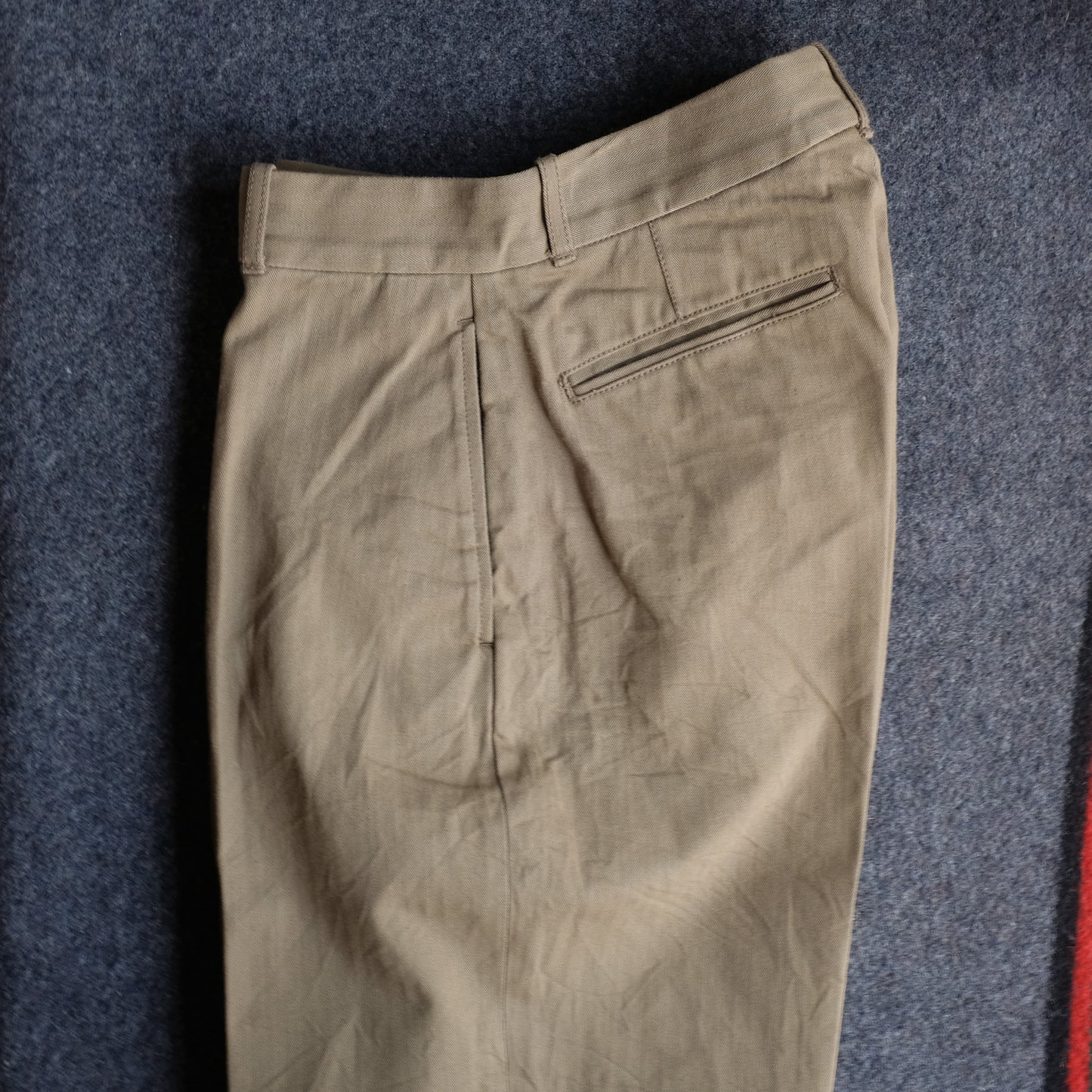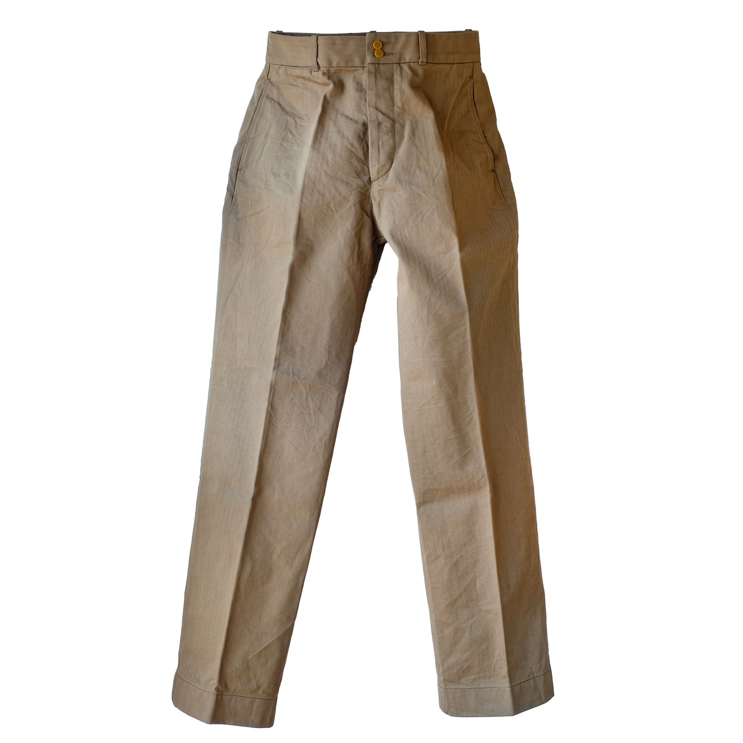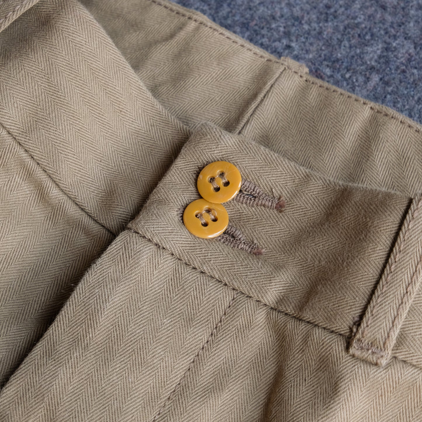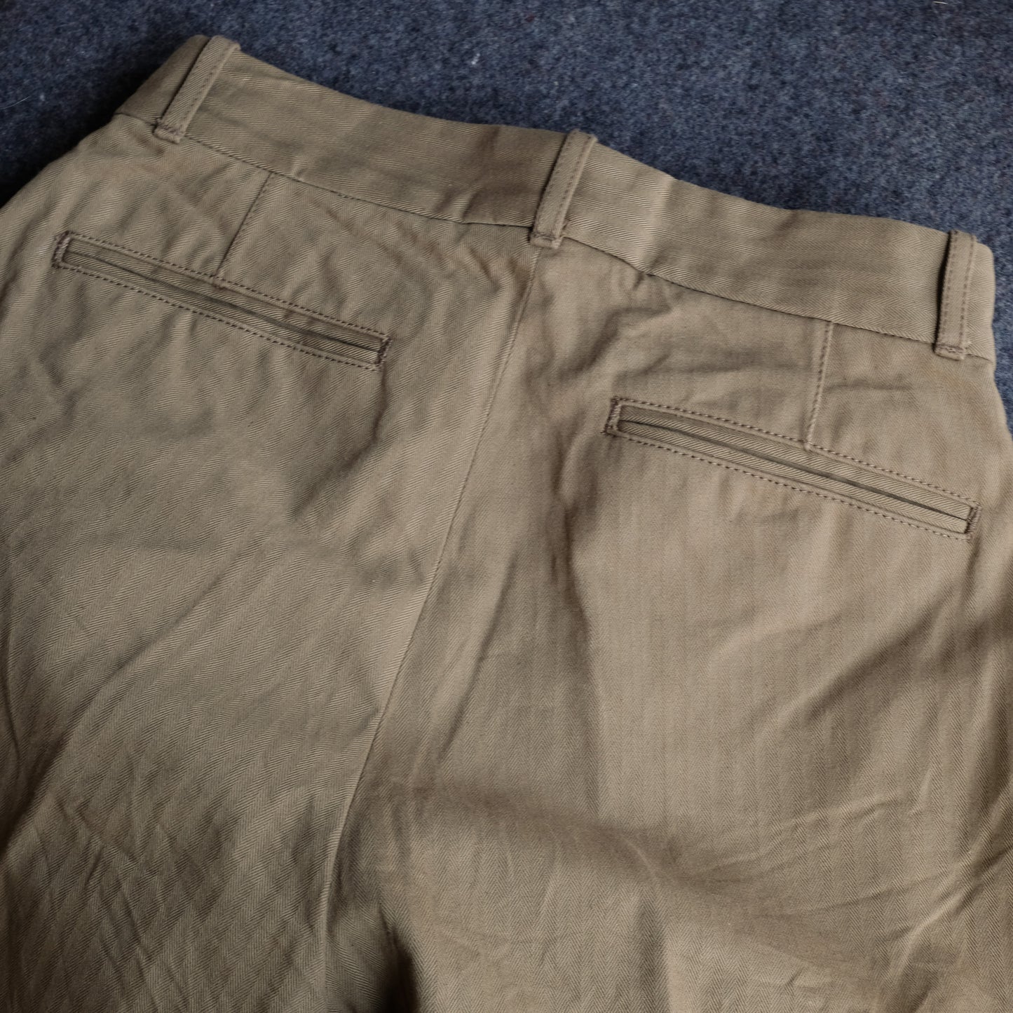 強撚りのコットンヘリンボーン生地のトラウザー。フロントは尿素ボタンフライ。コインポケット付き。ルーズフィット。