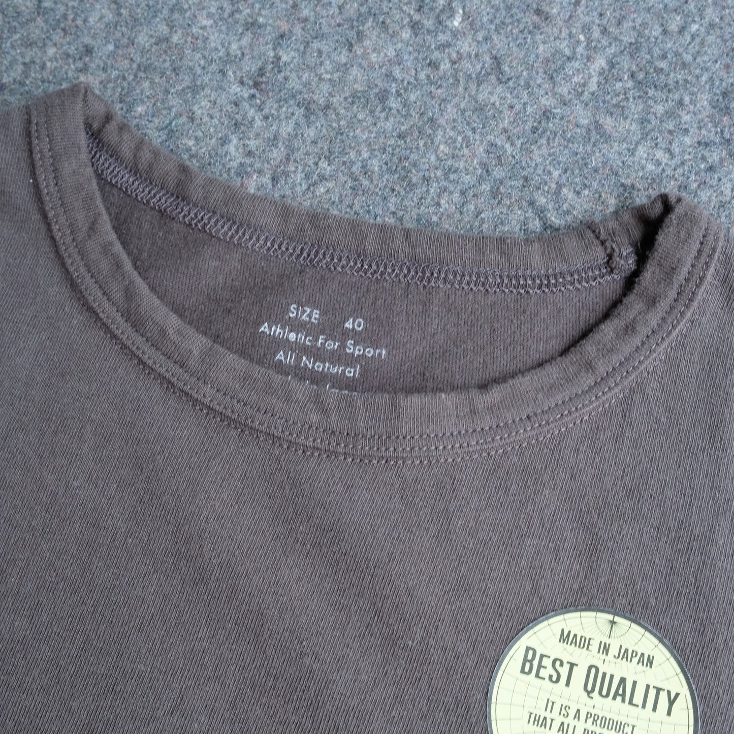 吊り編みによるオリジナルの丸胴Tシャツ。バインダーネックを身頃と同じ生地を使い、三本針の針落とし仕様。袖口と裾は天地始末。製品洗いによる縮み軽減加工済み。