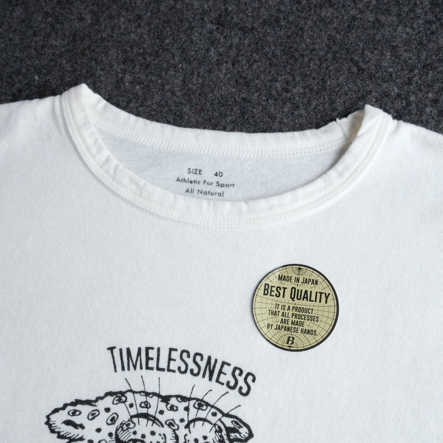 吊り編みによるオリジナルの丸胴Tシャツ。バインダーネックを身頃と同じ生地を使い、三本針の針落とし仕様。袖口と裾は天地始末。製品洗いによる縮み軽減加工済み。