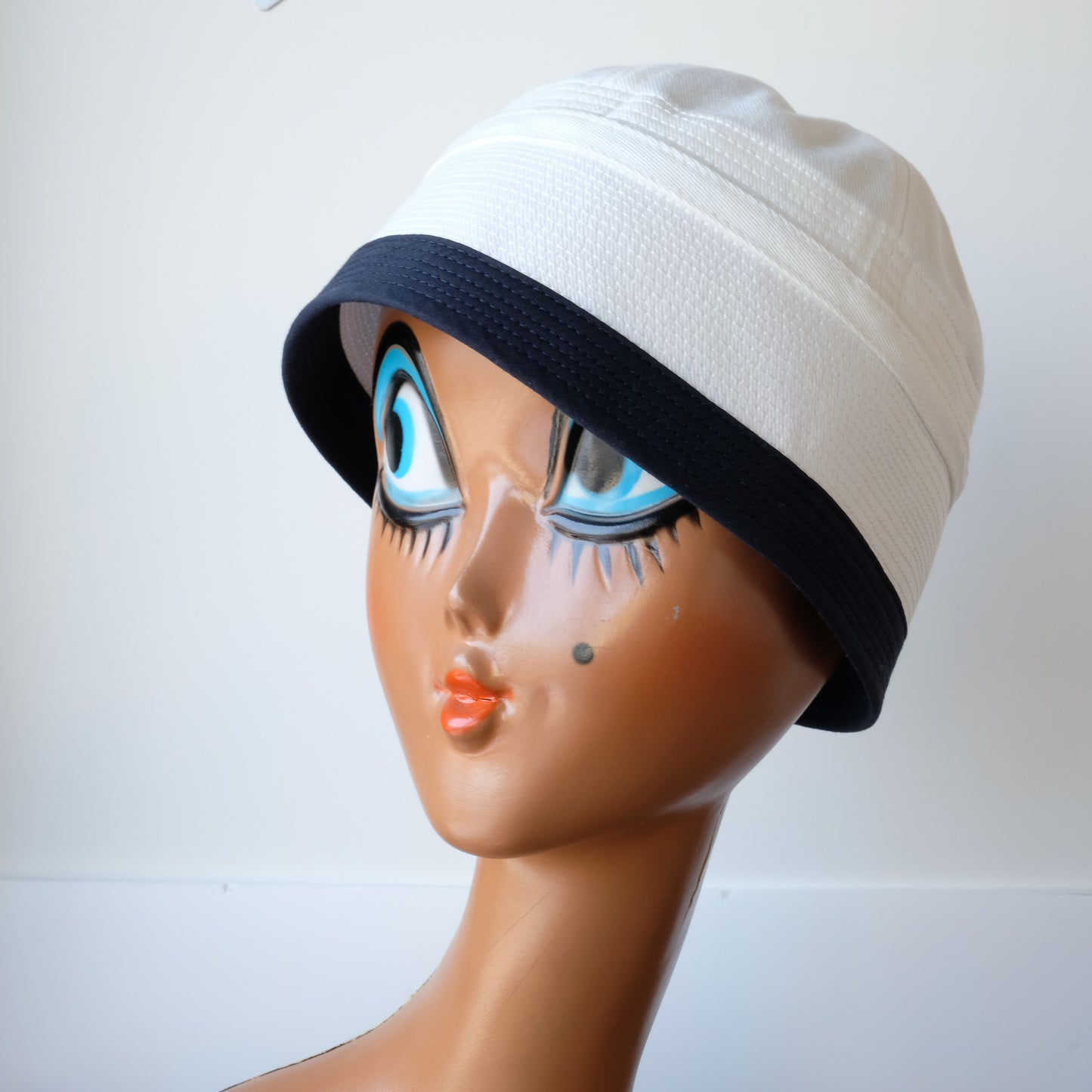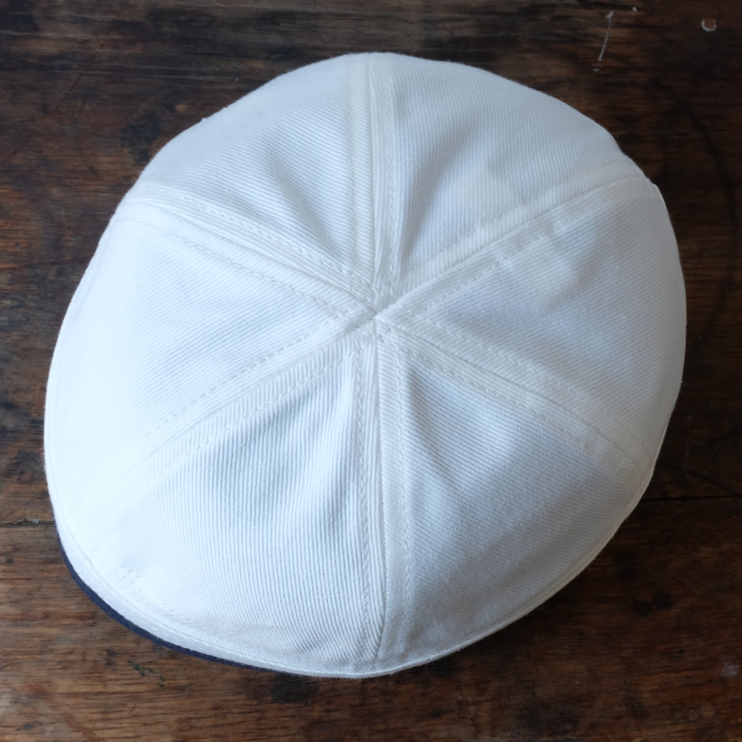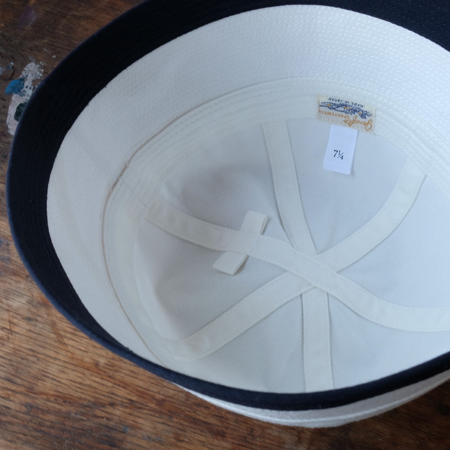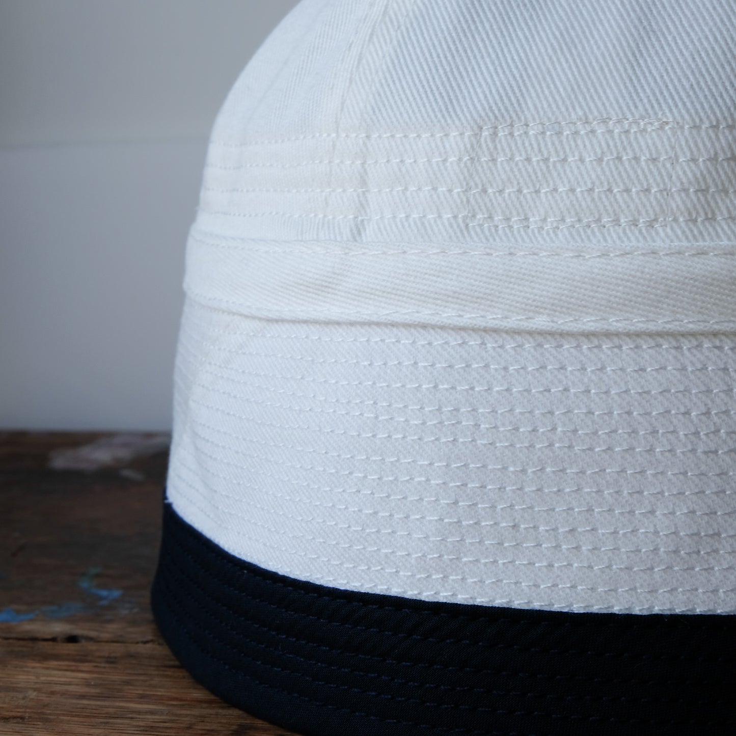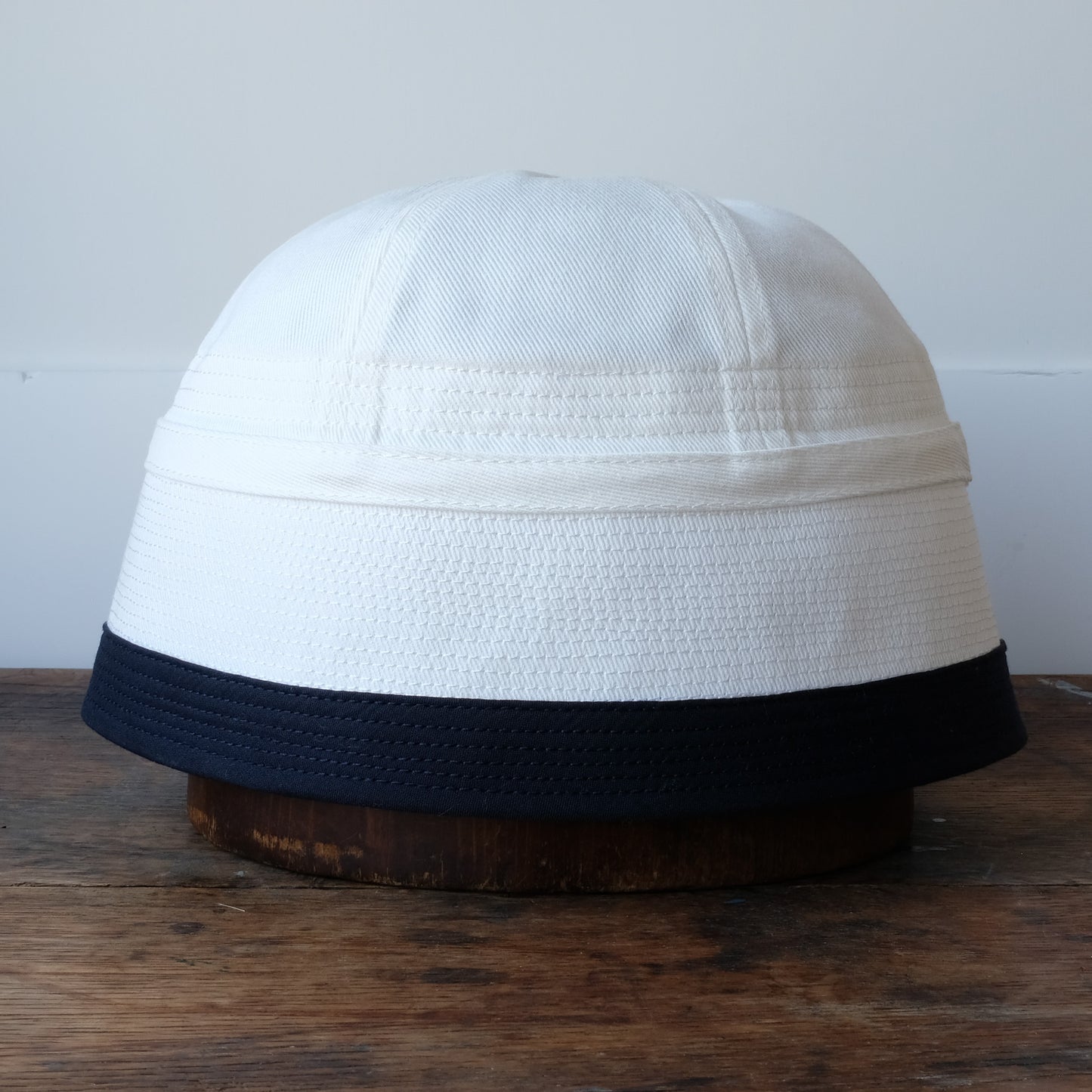 ホワイトツイルにネイビーの縁取りが施されたセーラーハット。