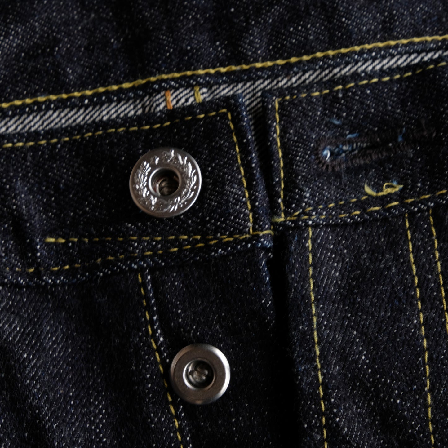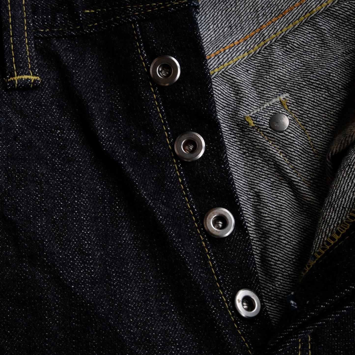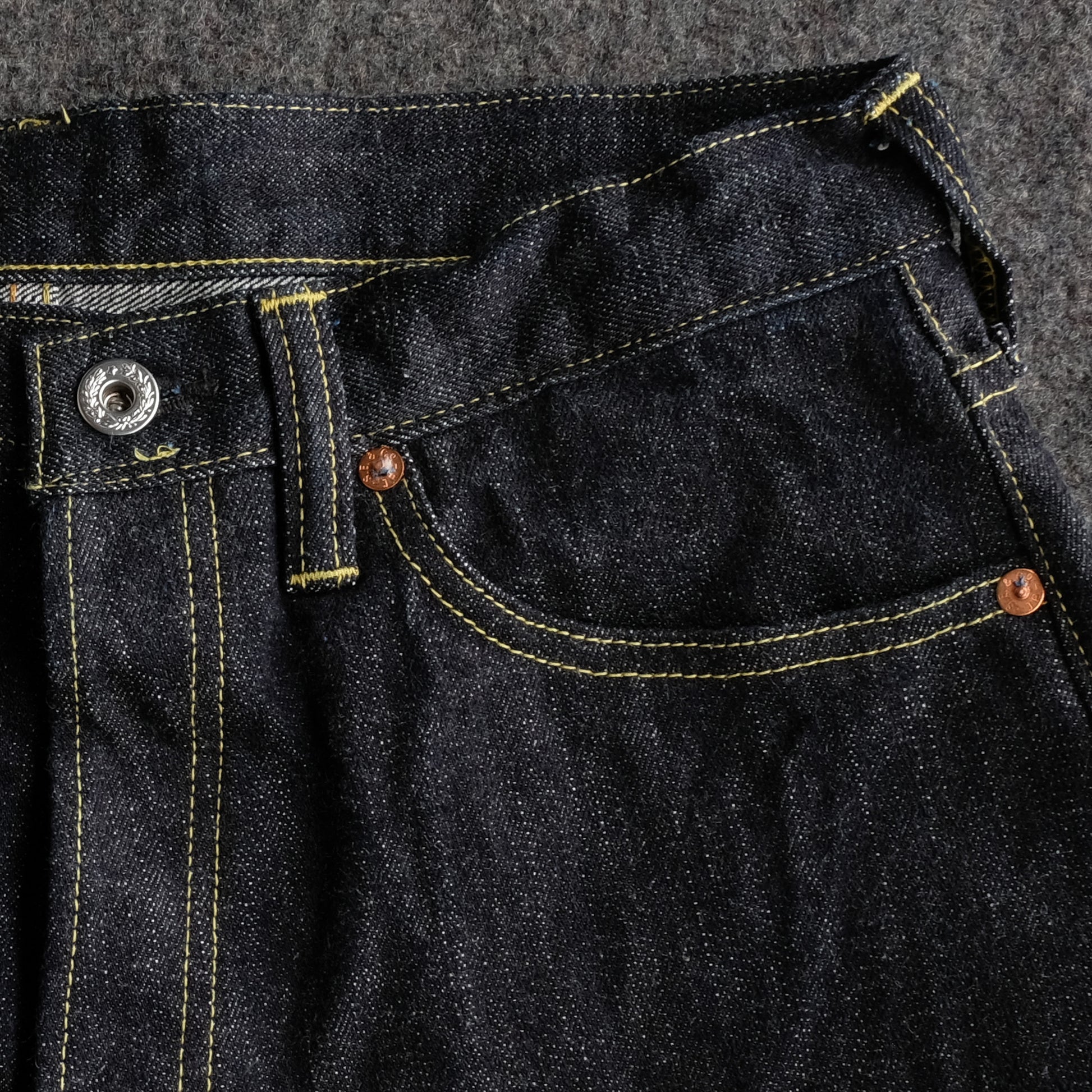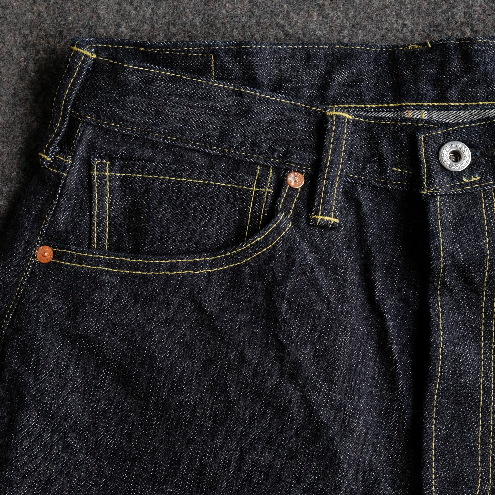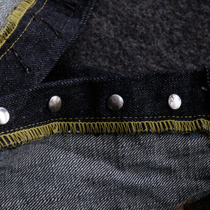 見えないところではありますが、隠しリベットもオリジナルの鉄製リベットを製作。長年穿きこんでいただきますと、リベット周りにサビが滲んできます。