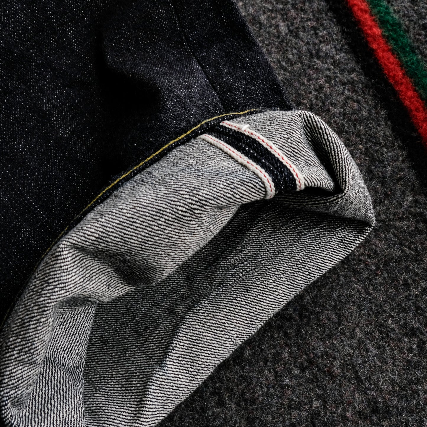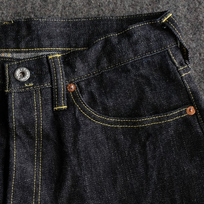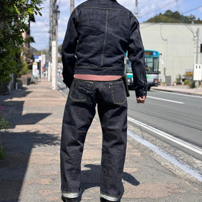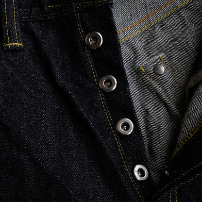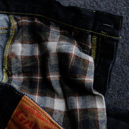 生地はもちろん日本製、岡山産6×6の14.5oz 限界弱テンションでゆっくりと織り上げられたザラ感の強い赤耳セルヴィッチです。