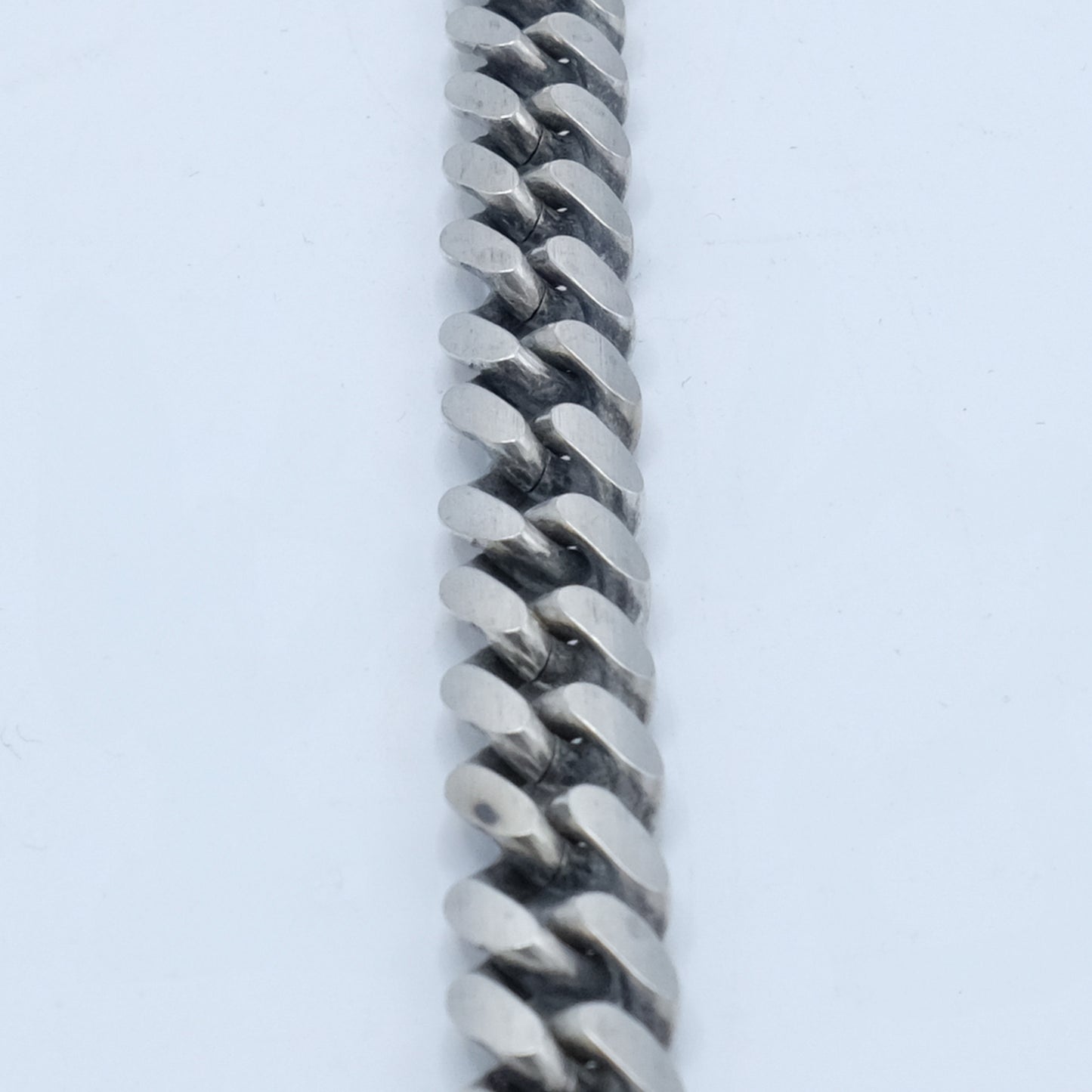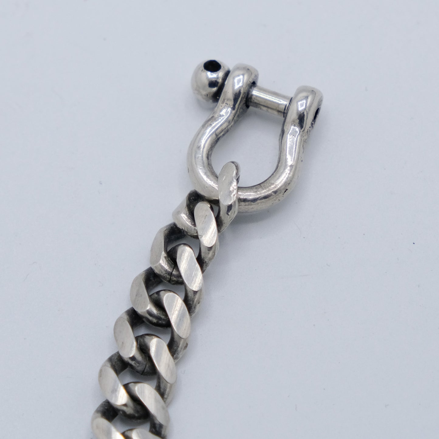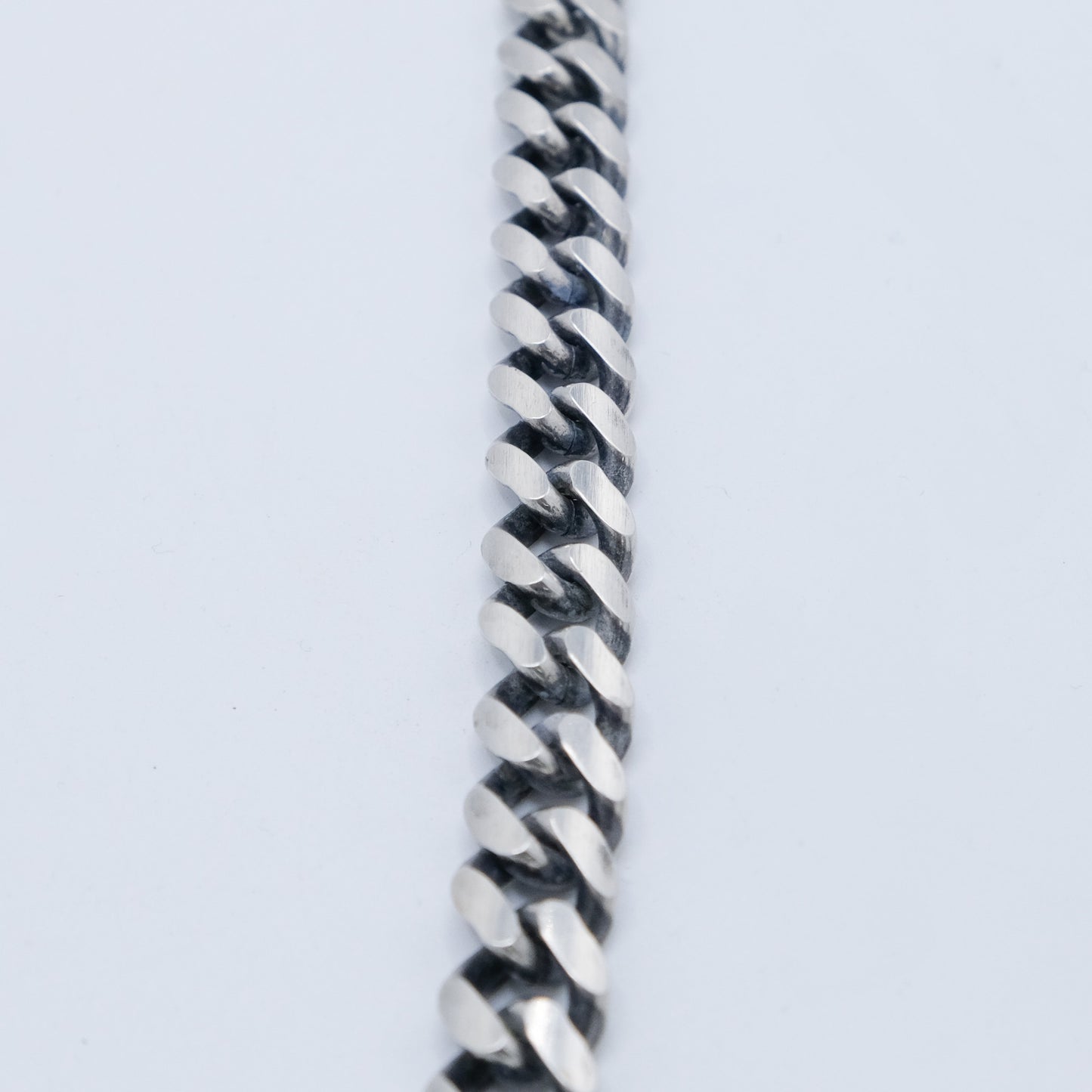 シルバーメッキ加工された喜平タイプのチェーンは滑らかで、無骨ながらも高級感があります。