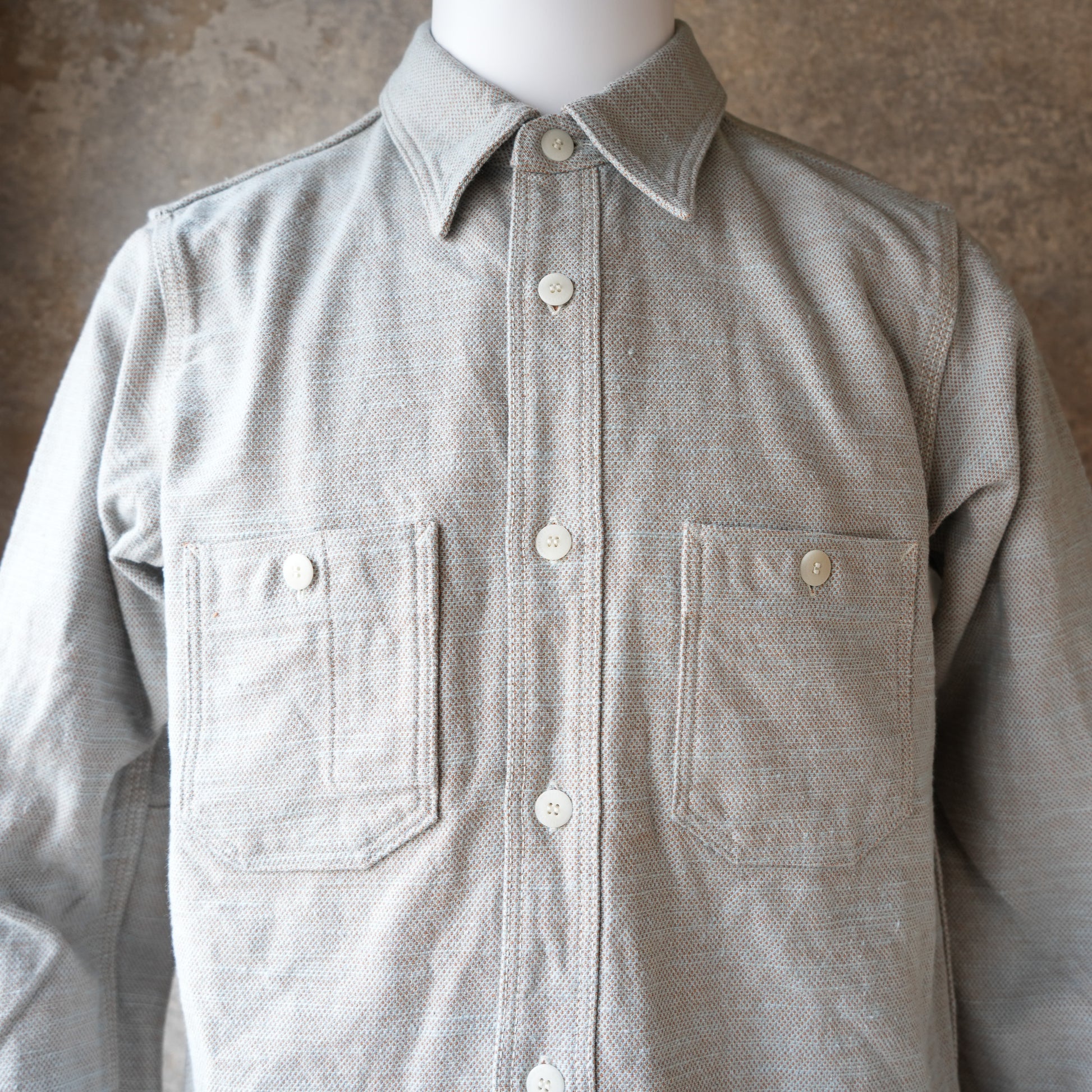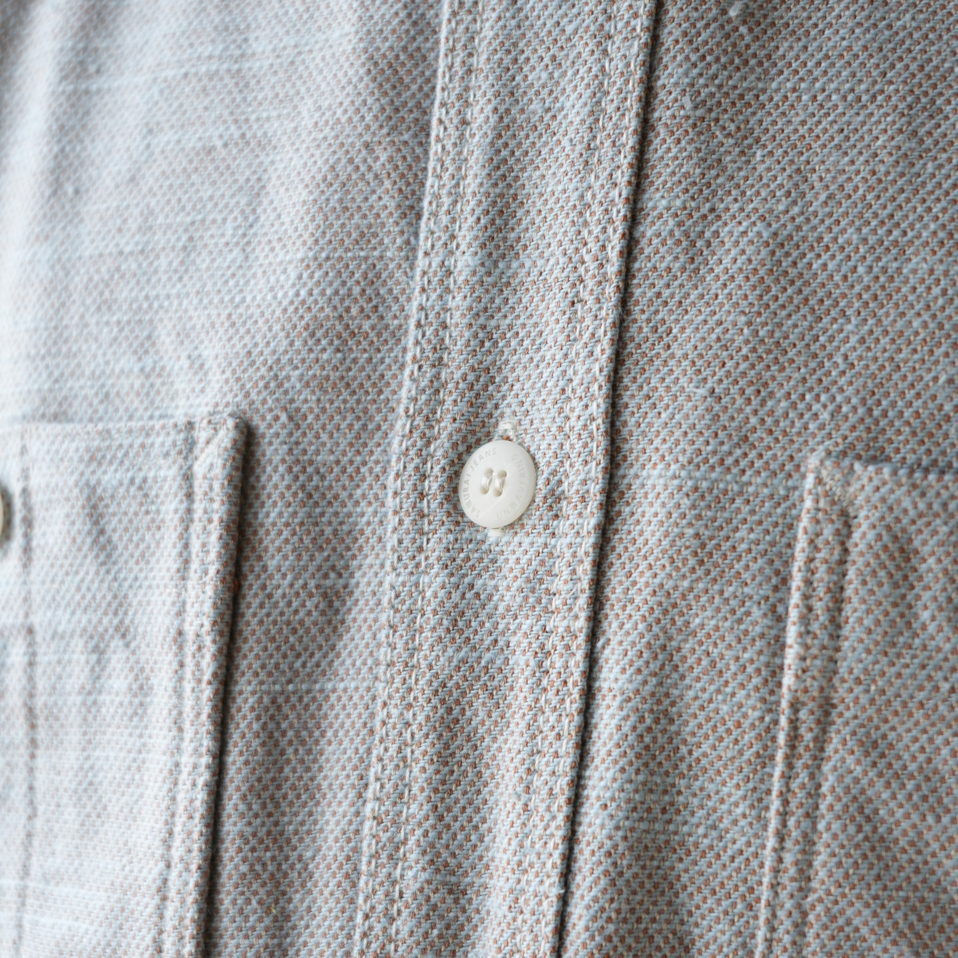 シャツはワークの要素を取り入れたデザインで、フラップの無い左右対称のポケット、肘当てが付き ます。ボタンはサムライ刻印入りのナットボタンの白色と茶色を使用、縫製はトリプルステッチ巻縫い 中心の堅牢な仕様となっています。