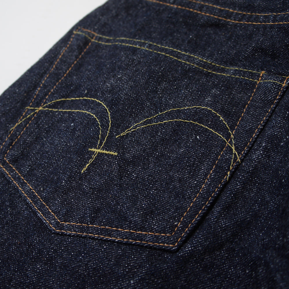 デニムは、テキサスコットンを使用した経緯6番のムラ糸による「男気15oz刀耳セルビッチ」仕様、荒々しいムラ感とメリハリのある縦落ち