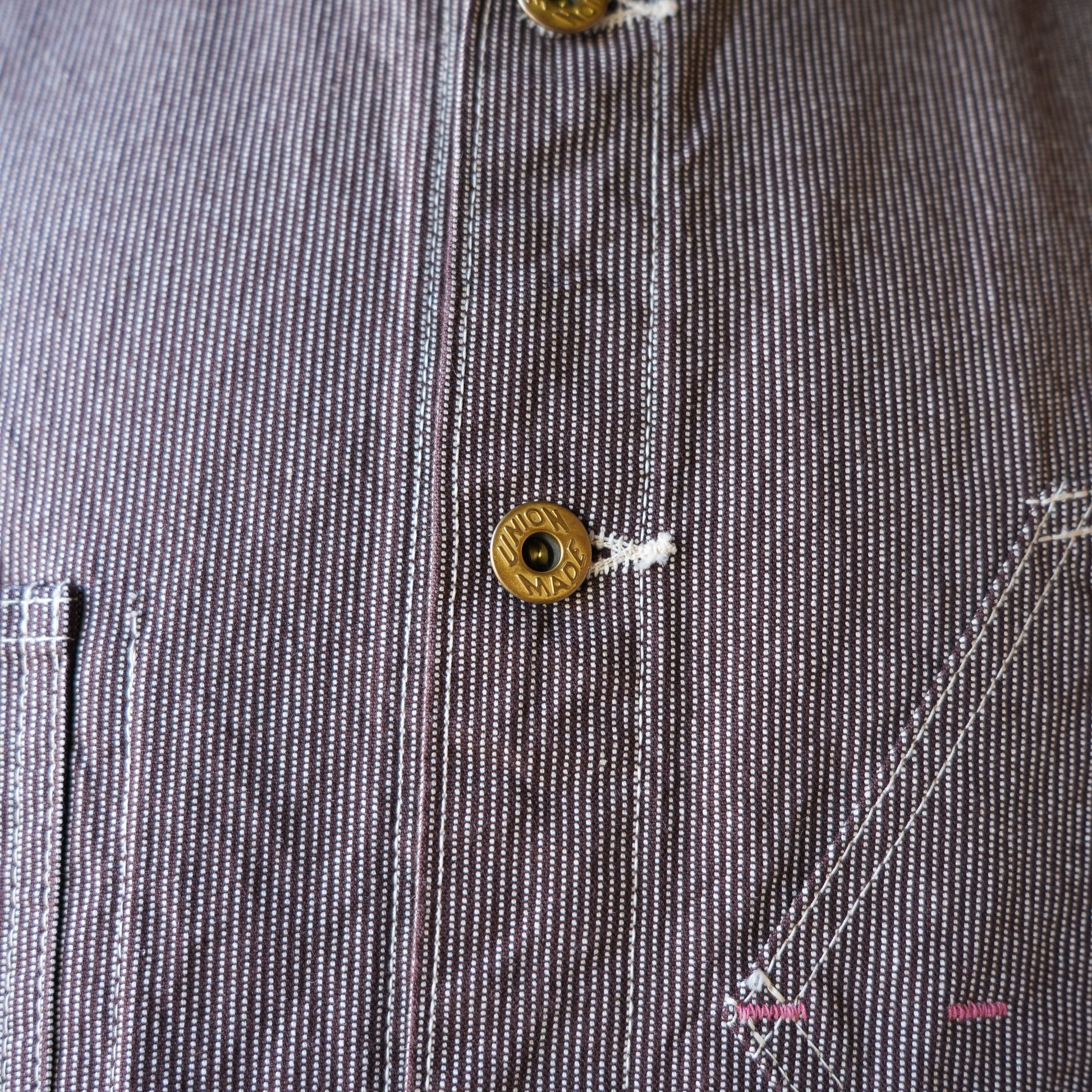 経糸にロープ染色にて染め上げた糸と生糸を引き揃えにして織りあげた生地なので、カラーの部分は少しずつ褪色していきます。新品時はパキッとした色合いが可愛いですが、色が抜けてきた頃にはビンテージのようないい生地感だなと思ってもらえるはずです。織りは平織ですので、言わば細かいチェックのダック地です。ですので、デニムよりもがっしりした生地感で、中に中綿などを着れば冬でも羽織っていただけるかと思います。。