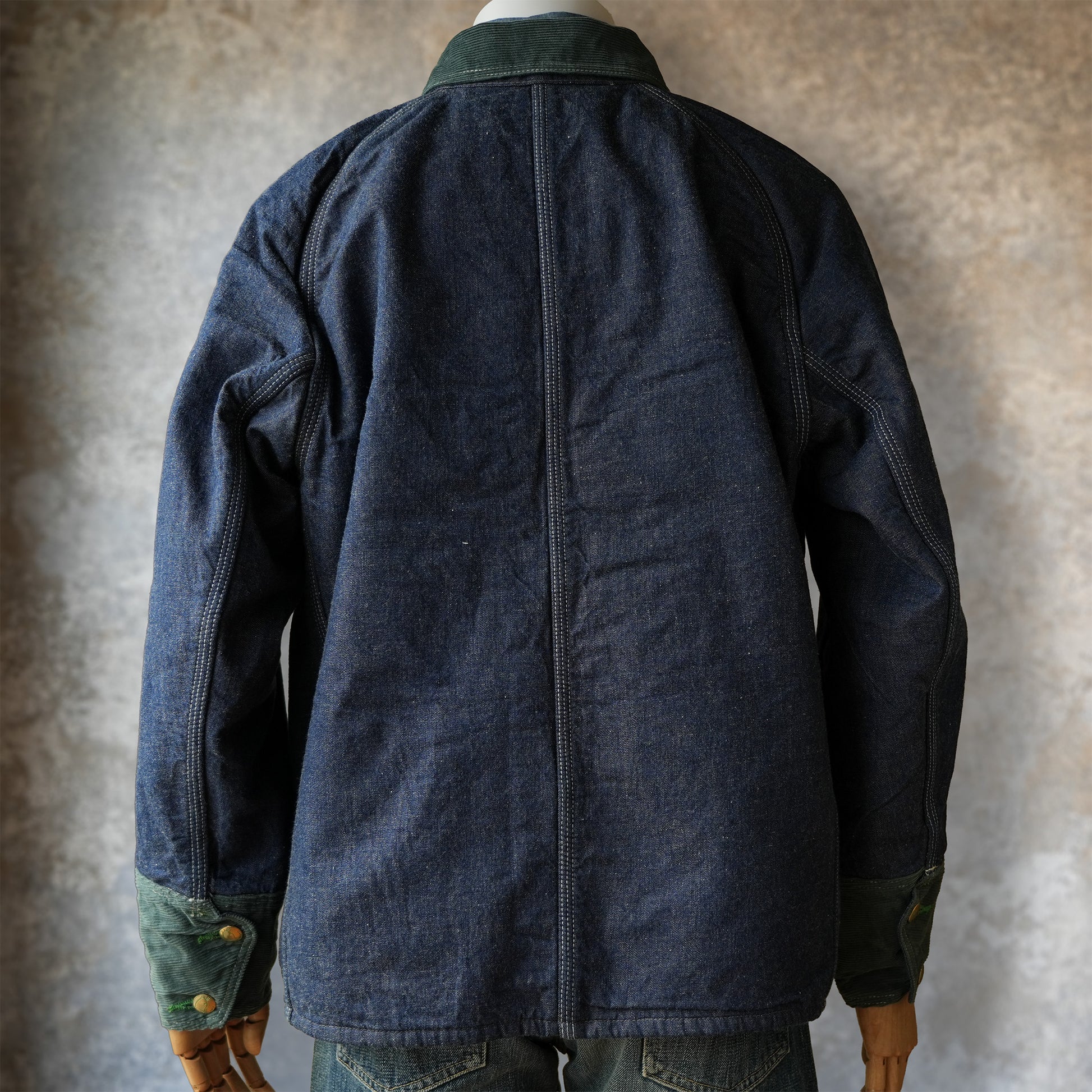 元ネタを画像で見つけて Ryo 君に 「これを作りたいんだけど、Vintage となかなか出会えないんだよね……」 と話したところ、 「それと同じ Vintage、オランダで買って持ってます」 と言われたのが始まりでした。 まさに灯台下暗しというか、少し運命的な出会いだったと思います。 今回、裏付きの Vintage を忠実に再現するのではなく、Cathead というシリーズそのものを大切にしたいと考えました。 実際、裏付きの Vintage に出会えたわけでもなく、そもそも存在するのかさえ分かりません。それでも、 「もし Cathead に裏付きがあったら?」 そんな妄想から、この企画はスタートしています。 一般的には、裏付きの場合、襟だけをコーデュロイにすることが多いですが、今回はとある Vintage を参考に、カフスとフラップにもコーデュロイを使用しました。 色も、定番のブラウン系ではなくグリーンに。元ネタの Vintage がバータックはもちろん、ボタンホールまでグリーンだったことから、この色を大切にしたいと思ったからです。