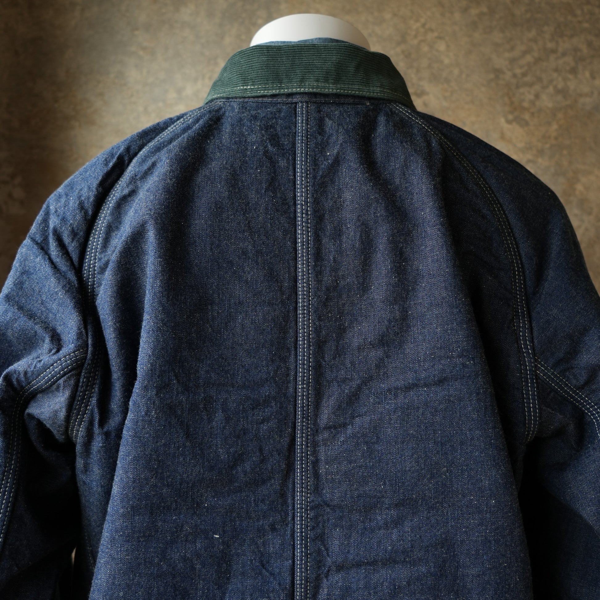 □デニム生地 生地もVintageを参考に糸ムラ形状から色、染色方法など細部にまで拘って貰いました。最近は一つの番手の糸でムラを表現するよりも異なる糸を混ぜてそれぞれの糸のムラ形状を変える方法を選択しております。 具体的には経糸だけで8番手にストレートの糸、9番手に短いムラの入った糸を1:1の割合で使用。 緯糸には12番手の自然なムラ糸と同じく12番手だけどネップの入った糸を1:1の割合で使用。結果的に4種類の糸を使用してる為、Vintageの雰囲気に仕上がる様になっています。 染色もストアブランド特有の浅めの色目で染めて貰いました。 経糸の浅い理由代わりに緯糸が生成りでは無くグレーで染まっています。 この考え方は、汚れを目立たせなくさせる為の各社の考えで経糸を濃色にする事に拘った生地も有ったと思いますし、横糸をグレーに染める事によって生地を濃色に見せて汚れを目立たせなくした生地も多かったのだと思います。仕上げとしては横糸の半分にネップ糸を使用してる為、毛焼き加工を施さずに仕上げて貰っています。 □サイズに関して 通常のCat Head Jacketにサイズ感を合わせて作成しております。