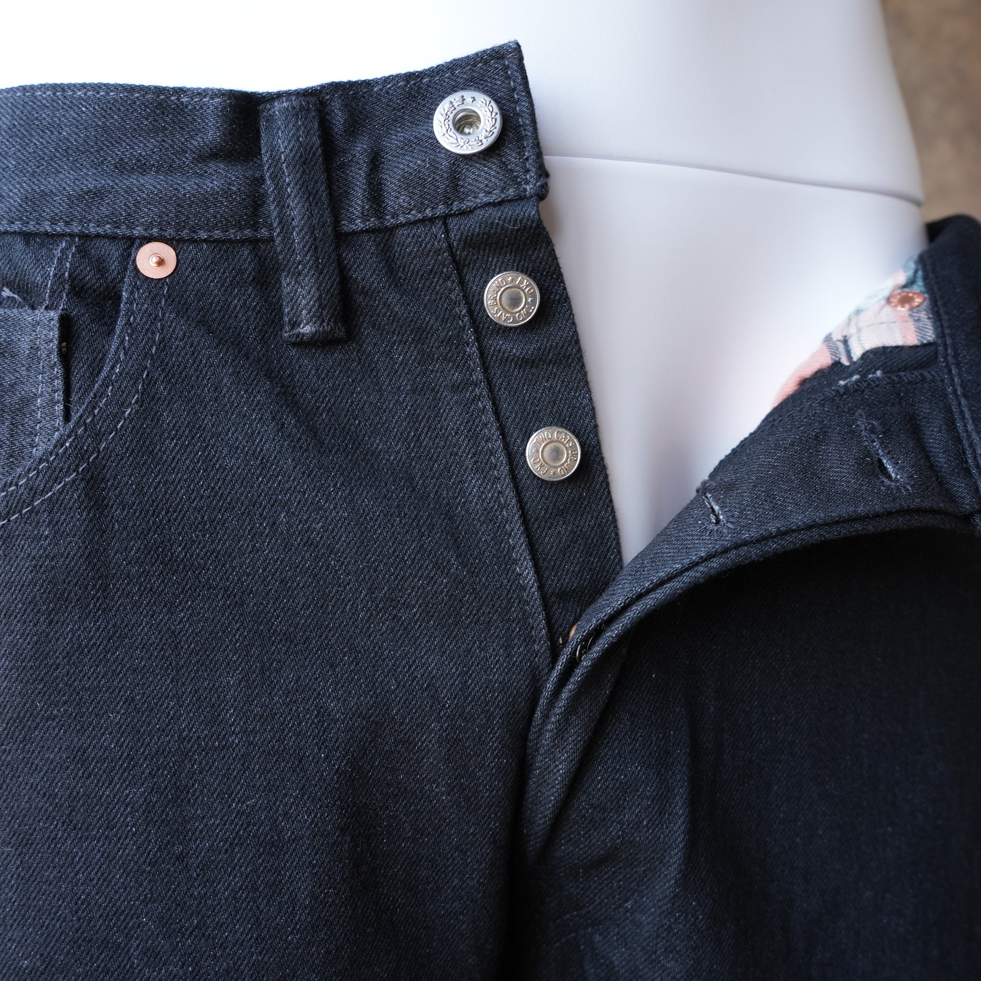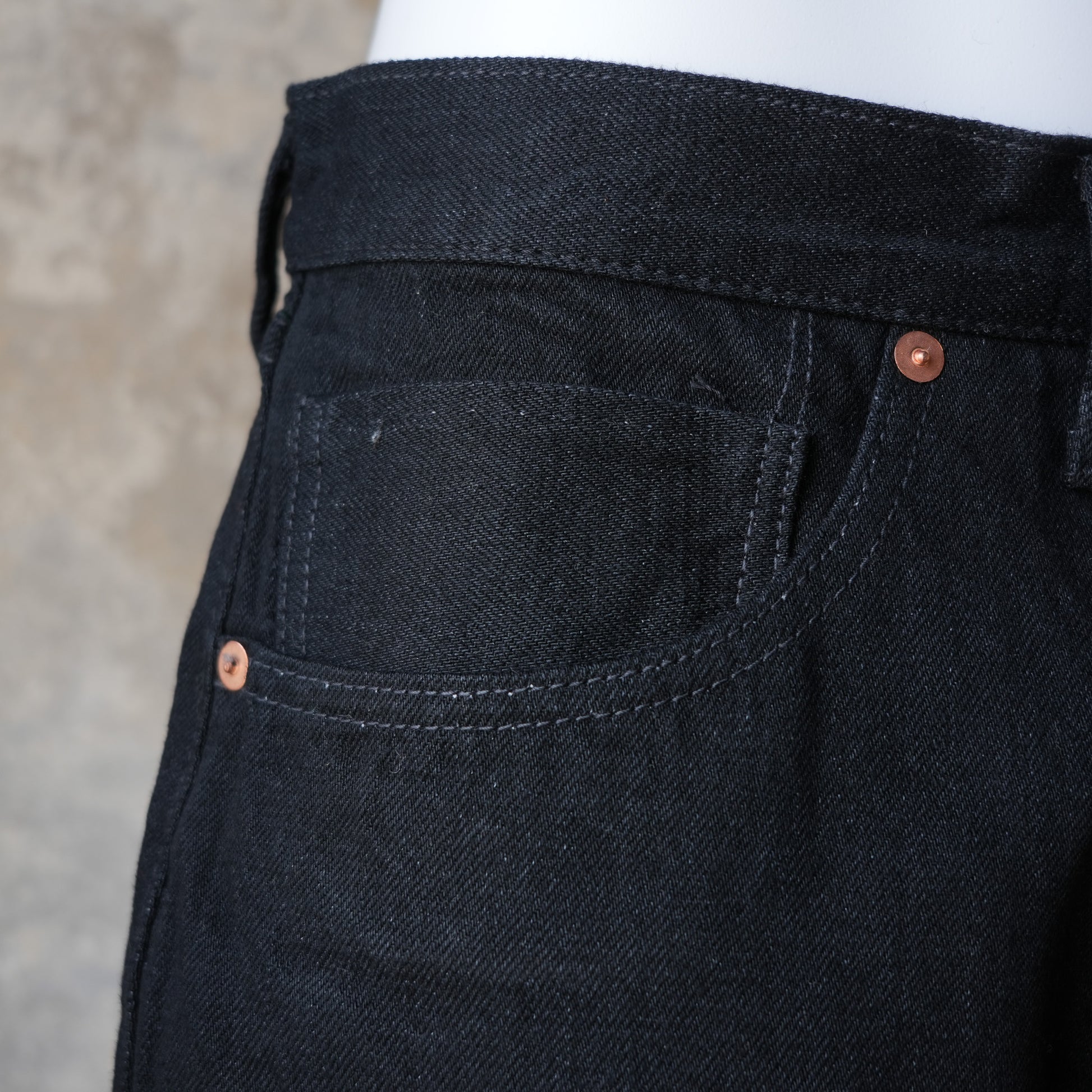 生機(きばた)のブラックデニムは流通量が少なく、本製品はブラックデニムの色落ちの特徴が確認できる仕様です。