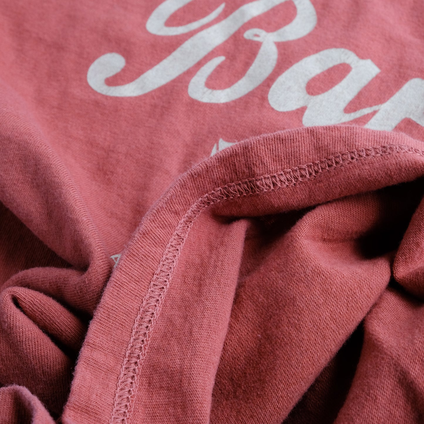 首まわりのリブの取り付けは、3つ折バインダー仕様としました。Tシャツは首周りが伸び切ってダメになることが多いですが、UESのTシャツは厚手のリブを25mm幅のバインダーネック仕様にすることで強度を確保しています。