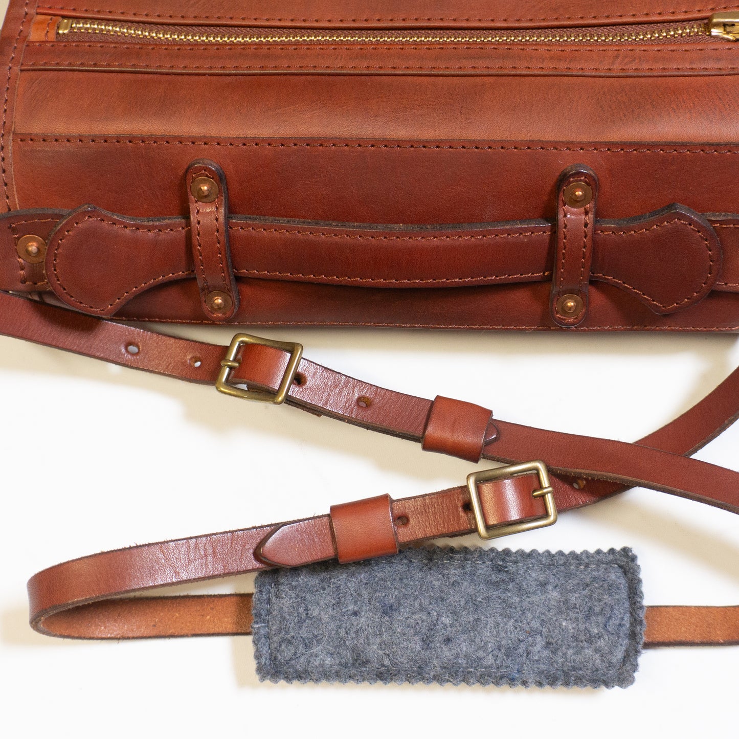 ミモザやチェスナットから抽出されたタンニンで鞣された、姫路産フルベジタブルタンニンレザーを" 丘染め" と呼ばれる伝統的なハンドメイド製法で一枚一枚丁寧に染め上げた後、オイルをたっぷり染み込ませ、独自のコガシ加工によりヴィンテージのような風合いに仕上げたオリジナルレザー「OLD OIL」を使用。使い込むほどに艶と風合いが増し、長く経年変化をお楽しみいただけます。