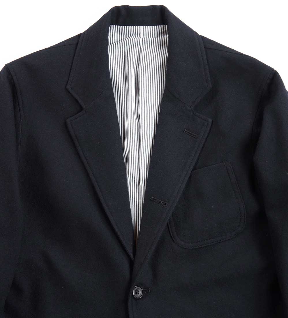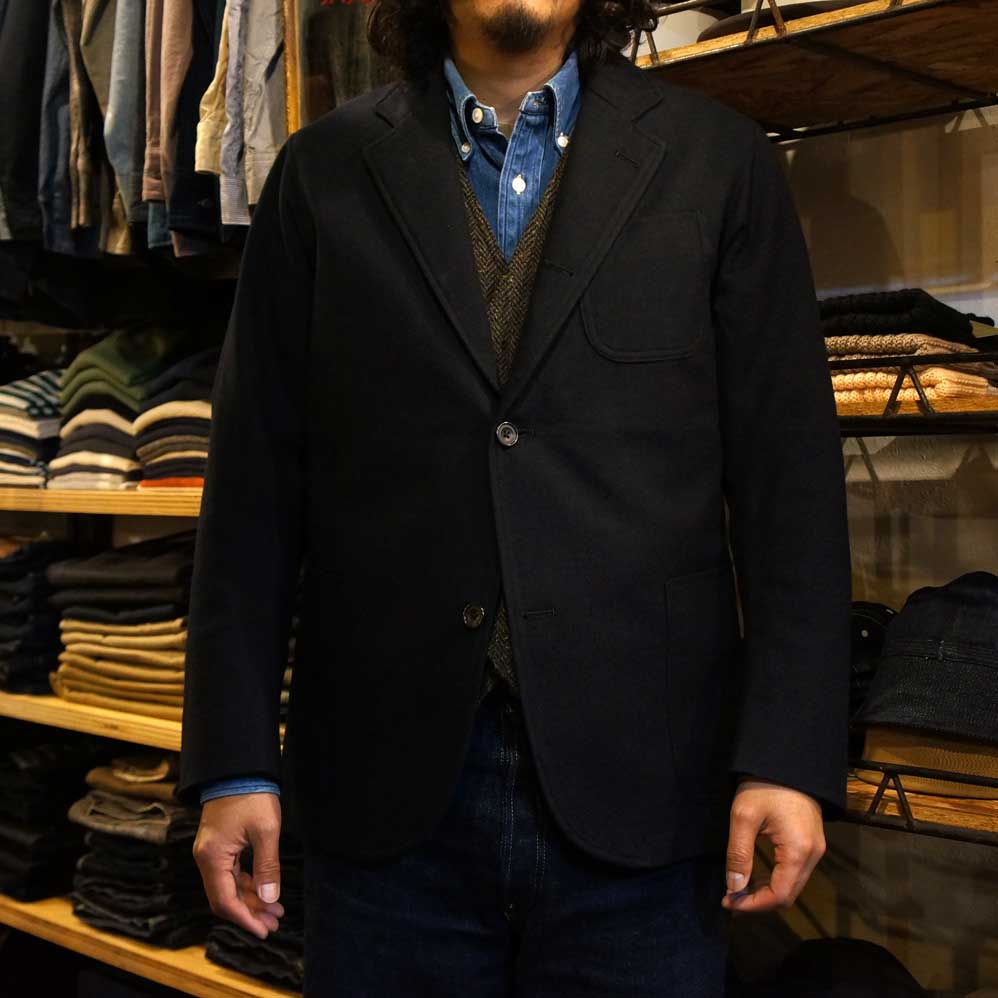 3ボタン段返りの裏地付きジャケット、Maple Leaf Jacket。今回は、樽型の3パッチポケット仕様です。素材は、経糸コットン、緯糸ウールのサージ。細めの番手で目が細かく、ザリッと硬めの生地感です。シャツの上はもちろんですが、USN Cotton SweaterやFC Turtle Neckの上にも好相性です。